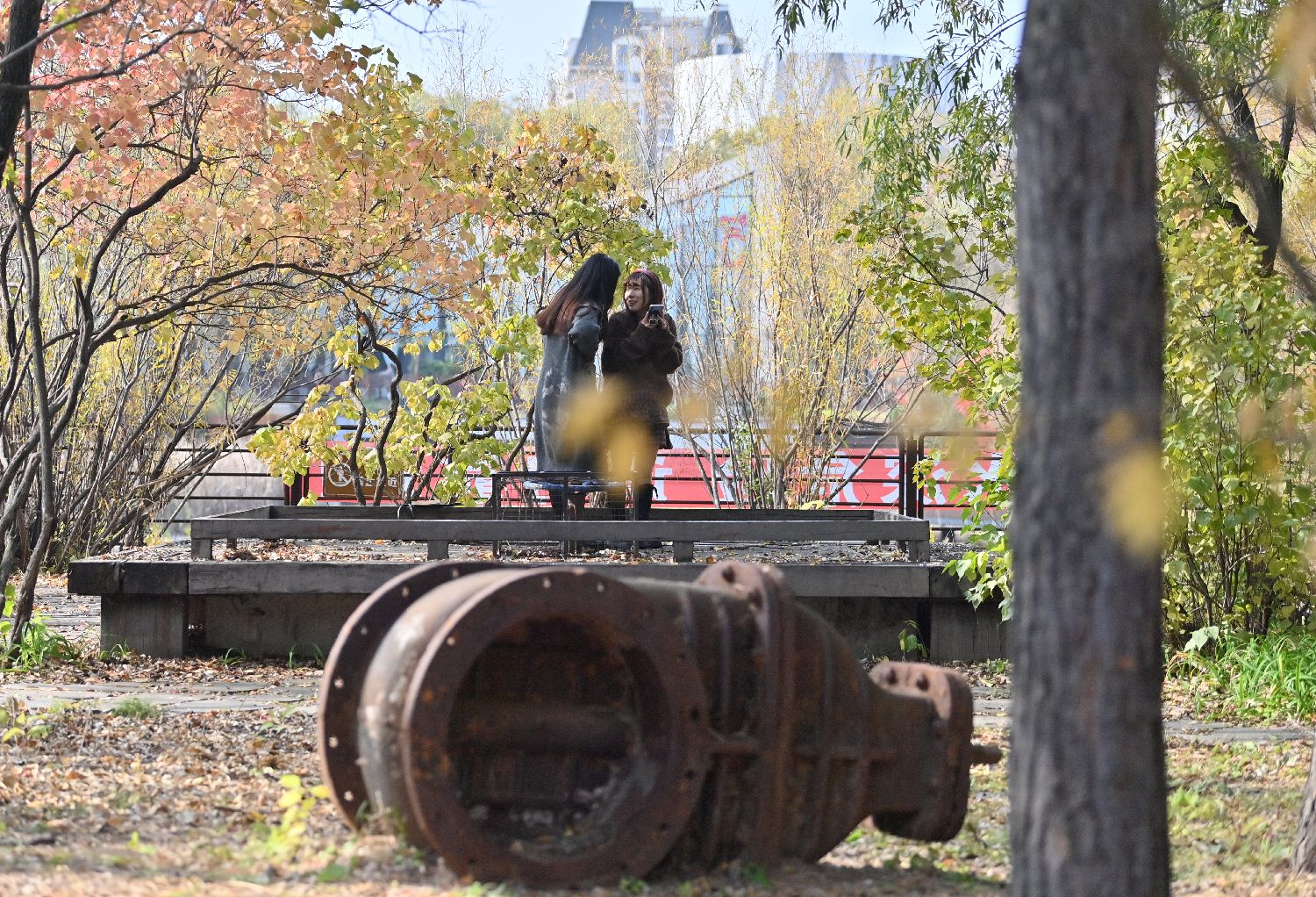 10月17日,在吉林长春水文化生态园,游客拍照留念。近年来,随着城市发展,长春很多老工厂陆续迁往新址,闲置的老厂房则被改建成具有纪念意义的工业遗址公园。长春水文化生态园原为长春净水厂,该厂遗留的设施、厂房与植物组成独特的秋景,吸引游人参观。(图片来源:中新社)