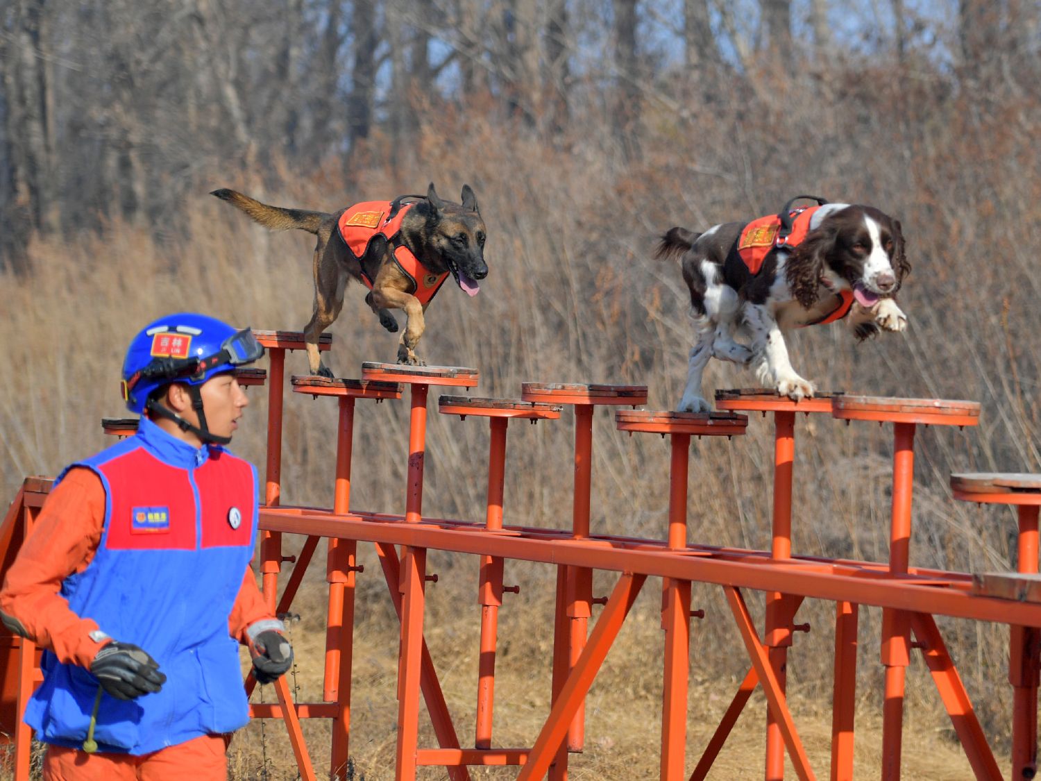 11月7日,在位于长春的吉林省森林消防总队特勤大队训练场内,搜救犬正在“冬日考试”,通过随行、指令召唤、障碍攀登、绕腿训练、废墟搜索等科目,检验搜救犬在寒冷环境的适应和实战能力。图为搜救犬在快速通过跺桥。(图片来源:中新社)