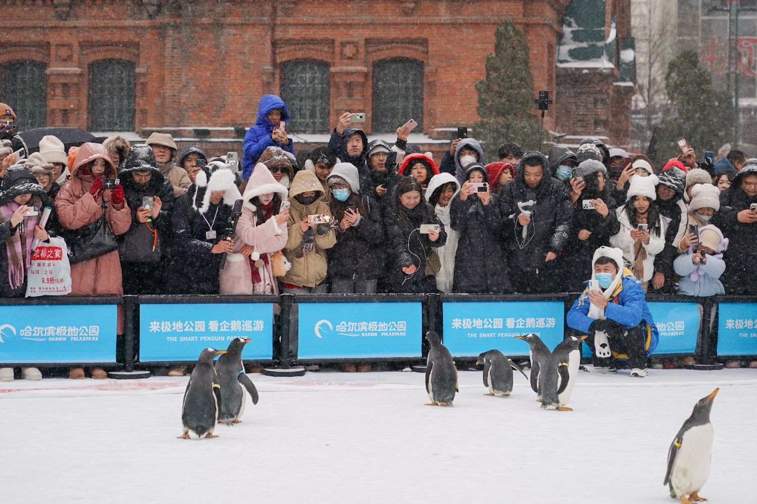 11月26日,哈尔滨极地公园的原创文旅IP“淘学企鹅”开启今冬冰雪季首次外出“打卡”,10只企鹅迈着小碎步来到哈尔滨地标建筑索菲亚教堂,召开首场巡游“粉丝见面会”。图为企鹅吸引民众。(图片来源:中新社)