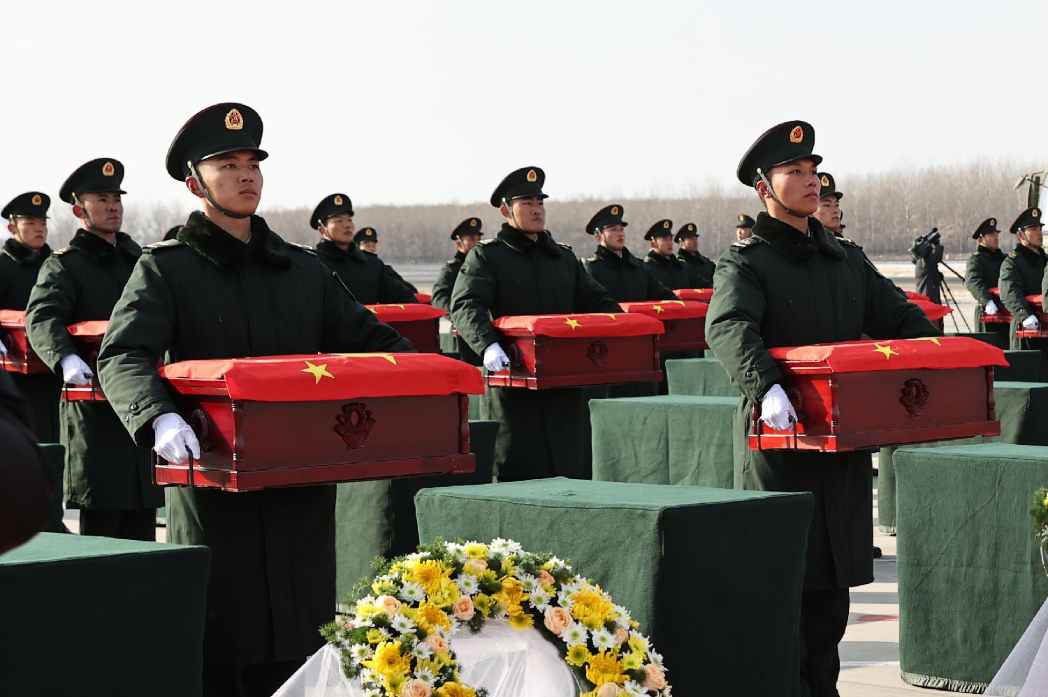 11月28日,第十一批在韩中国人民志愿军烈士遗骸回到祖国母亲的怀抱,43位志愿军烈士英灵及495件遗物由中国空军运-20专机从韩国接回并护送至辽宁沈阳。图为礼兵将殓放志愿军烈士遗骸的棺椁从棺椁整理区护送至棺椁摆放区。(图片来源:中新社)