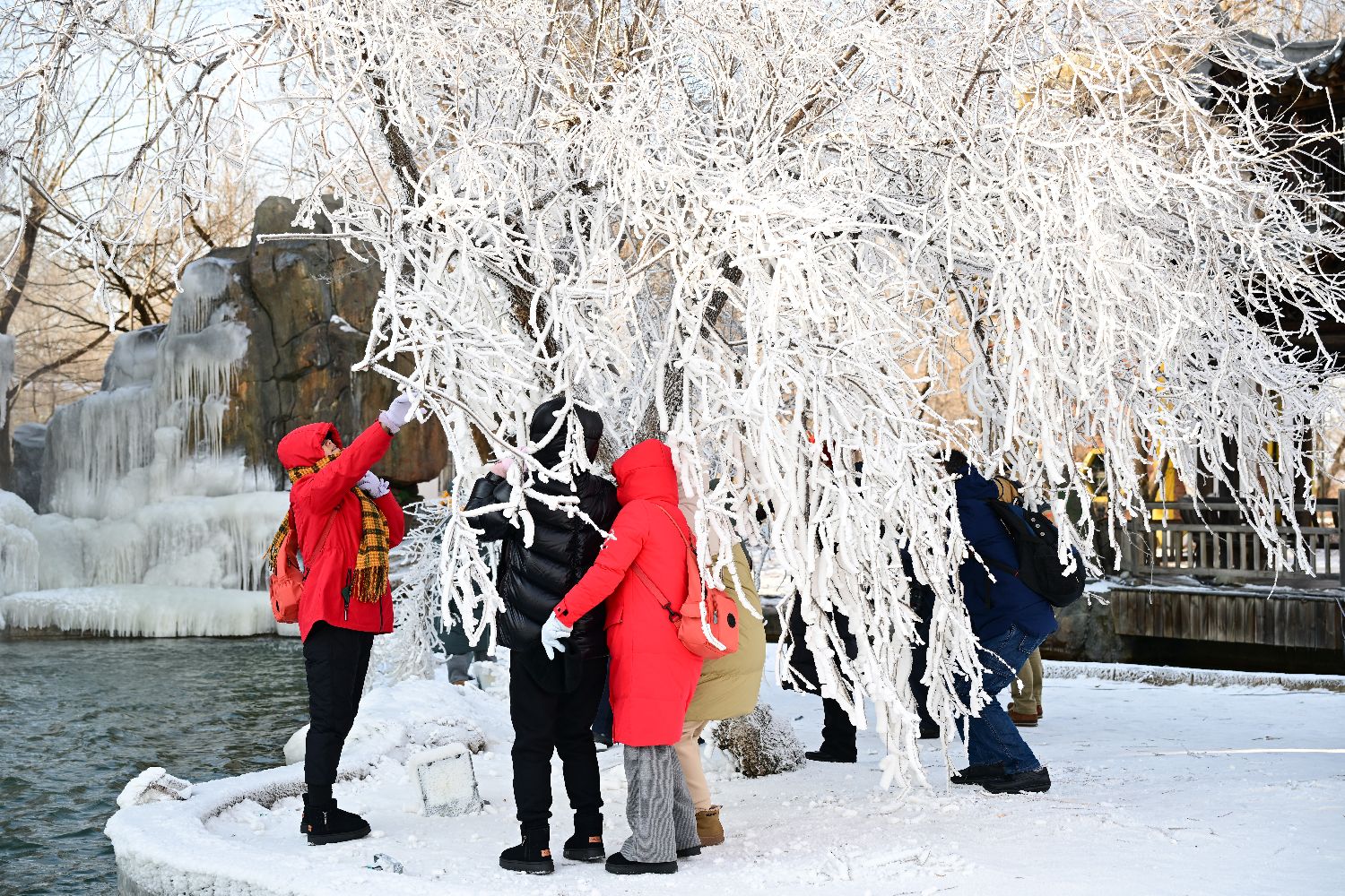 12月4日,吉林省吉林市,游客在雾凇岛观赏雾凇。随着吉林雾凇冰雪节的开幕,八方游客前往吉林市观赏雾凇、体验滑雪,带动吉林市冰雪经济逐步升温。(图片来源:中新社)