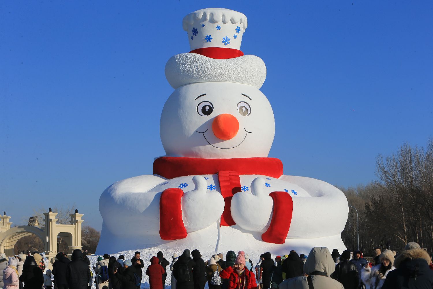 12月8日,哈尔滨市今年冰雪季首个建成的大型雪雕——第37届太阳岛雪博会“雪人先生”亮相迎客。这座高达20米、用雪量达4000立方米的巨型雪雕,以标志性的雪花礼帽、红色围脖和可爱的面容,展现了雪雕艺术的热情与活力。此外,雪博会首批作品《悟空归来》和《传奇圣火》正在加紧雕刻中。图为雪博会首批作品“雪人先生”。(图片来源:中新社)