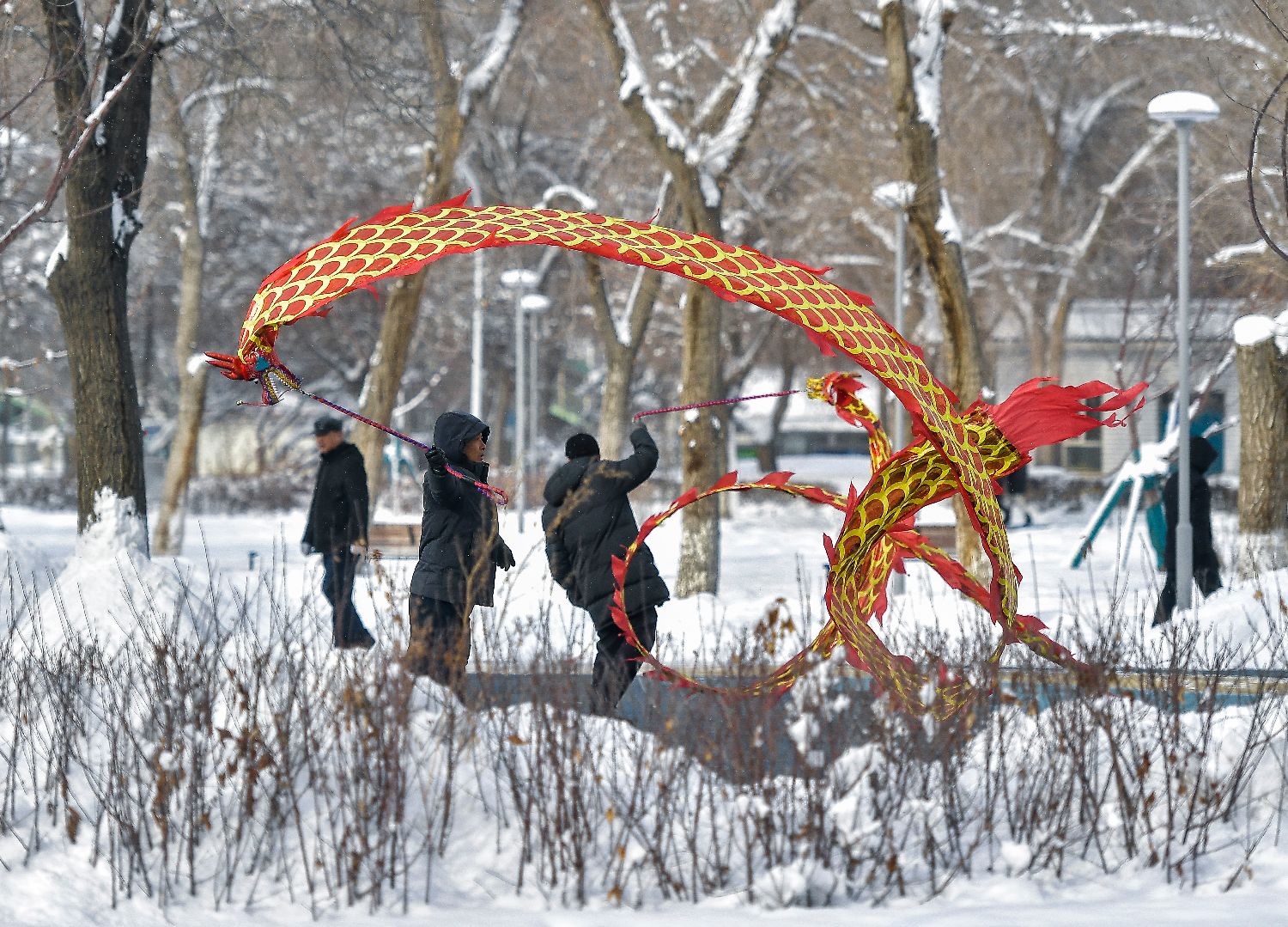 12月12日,新疆乌鲁木齐市,市民在公园里练习舞龙。经过连续多日的降雪后,该市迎来晴好天气,公园里各种建筑及树木上落满白雪,远远望去如“玉树琼花”般美丽,吸引市民前来游玩。(图片来源:中新社)