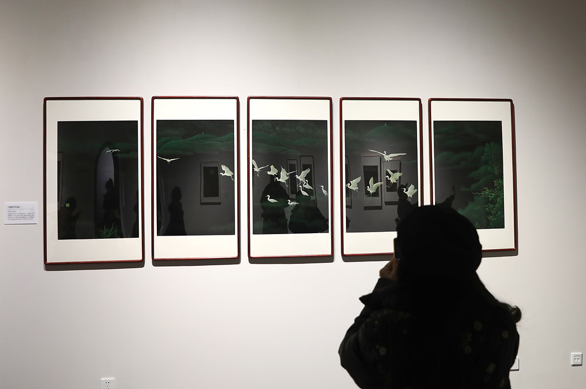 12月17日,“玄纸绘——王静纸上刀绘艺术作品展”在沈阳博物馆展出,此次展览集中展示了王静约40幅纸上刀绘精品力作。图为观众在观看展出的作品《和谐共生曲》。(图片来源:中新社)