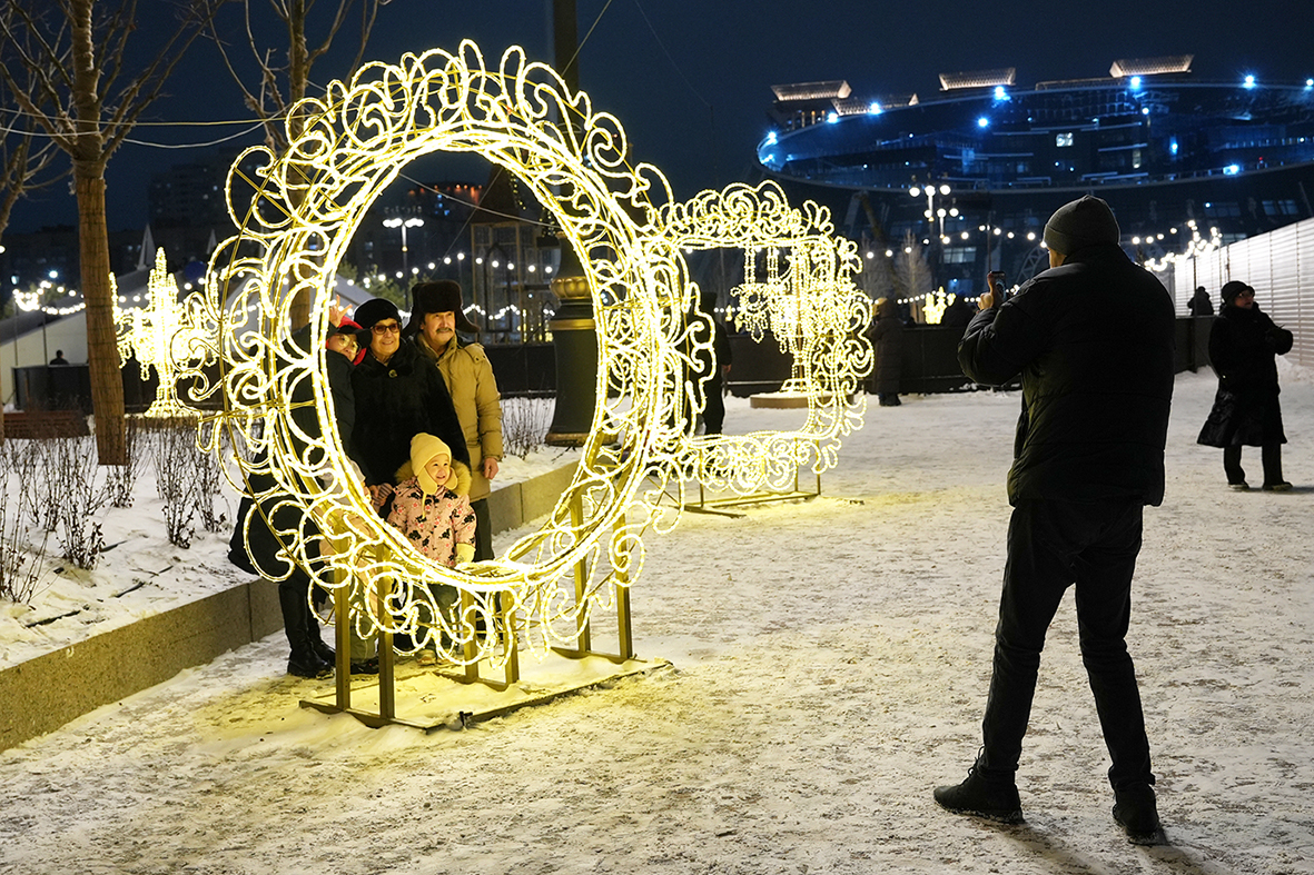 当地时间12月18日20时,哈萨克斯坦首都阿斯塔纳在全市6个城区同时点亮30余棵新年枞树彩灯,拉开新年庆祝活动序幕。为增添节日气氛,枞树周边还布置有新年主题的灯光装饰和雕塑,供民众拍照留念。图为民众在新年灯饰前拍照。(图片来源:中新社)