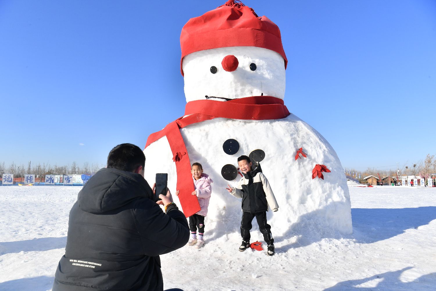 1月15日,河北雄安新区郊野公园一冰雪乐园内,游客趣玩冰雪,感受冬季的快乐。图为游客在巨型雪人下合影。中新社