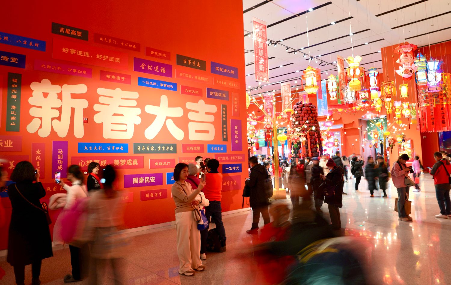1月21日,北京,“新春大吉”祝福语吸引观众打卡。临近春节,中国工艺美术馆(中国非物质文化遗产馆)的“过年——春节主题展”吸引众多市民游客参观。该展通过艺术化呈现与春节相关的非物质文化遗产代表性项目,让观众体验浓浓年味。(图片来源:中新社)