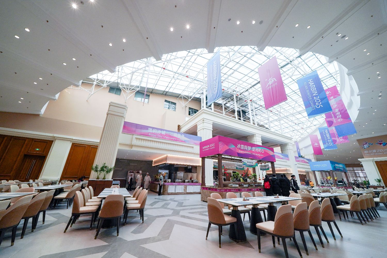 1月25日,黑龙江省哈尔滨市,哈尔滨亚冬会冰上项目运动员村运动员餐厅。华旗饭店作为2025年亚冬会冰上项目运动员村共计41层建筑,赛会期间,这里主要为运动员及随队官员提供居住、办公、商业、医疗、餐饮、休闲等服务保障。目前,各项工作已准备就绪。(图片来源:中新社)