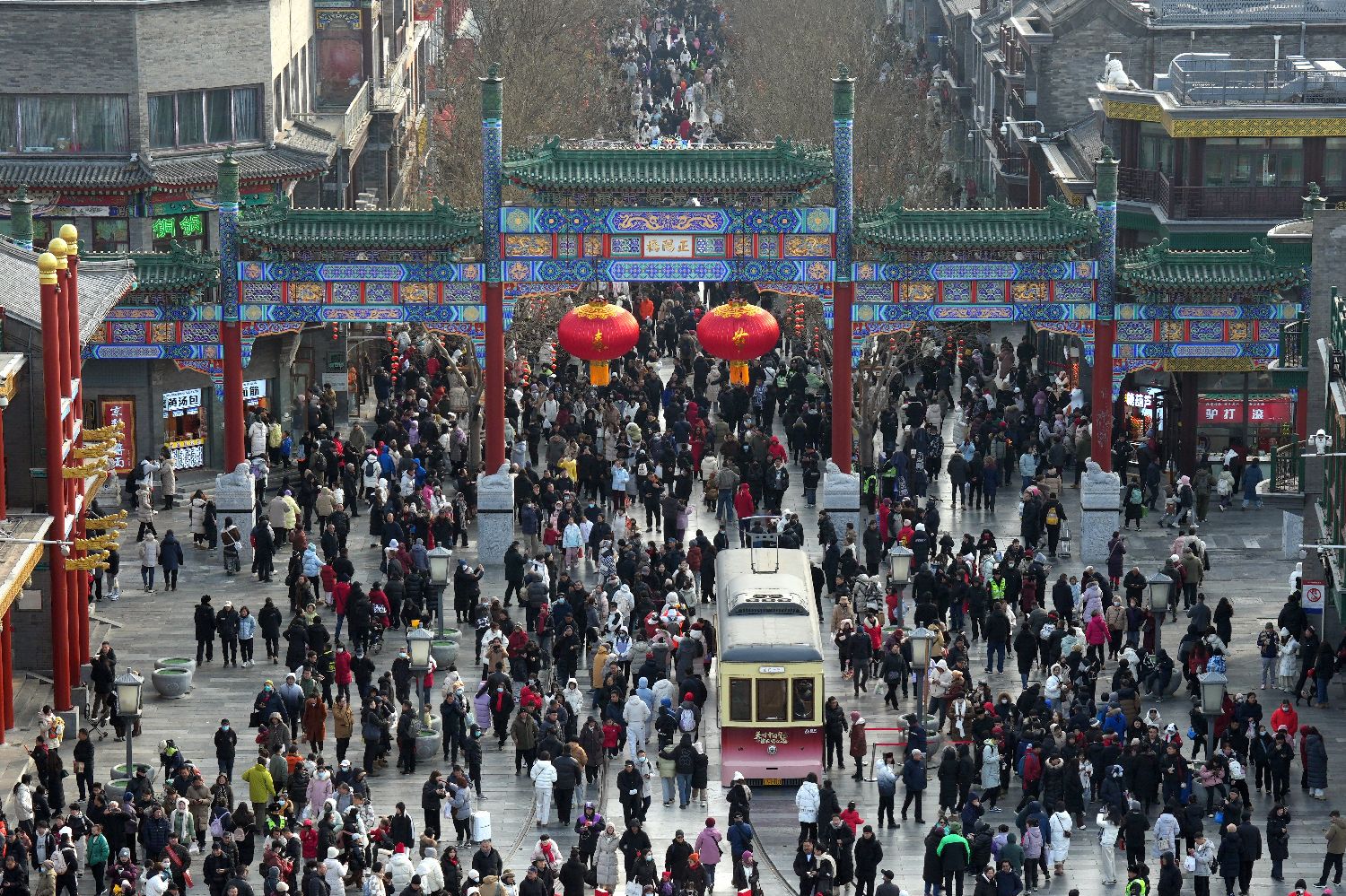 1月30日(农历大年初二),北京前门大街游人如织。前门大街位于北京中轴线上,蛇年春节是北京中轴线和春节申遗成功后的首个新春佳节。(图片来源:中新社)