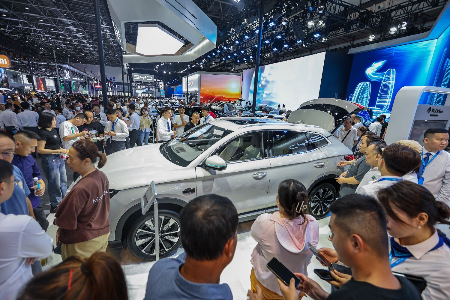 3月14日,比亚迪展台人头攒动。当日,2025海南国际车展暨海口国际智能新能源汽车展览会正在海南海口举办。本届车展展出面积达6万平方米,吸引上百家车企携千余款车型亮相。中新社记者骆云飞摄