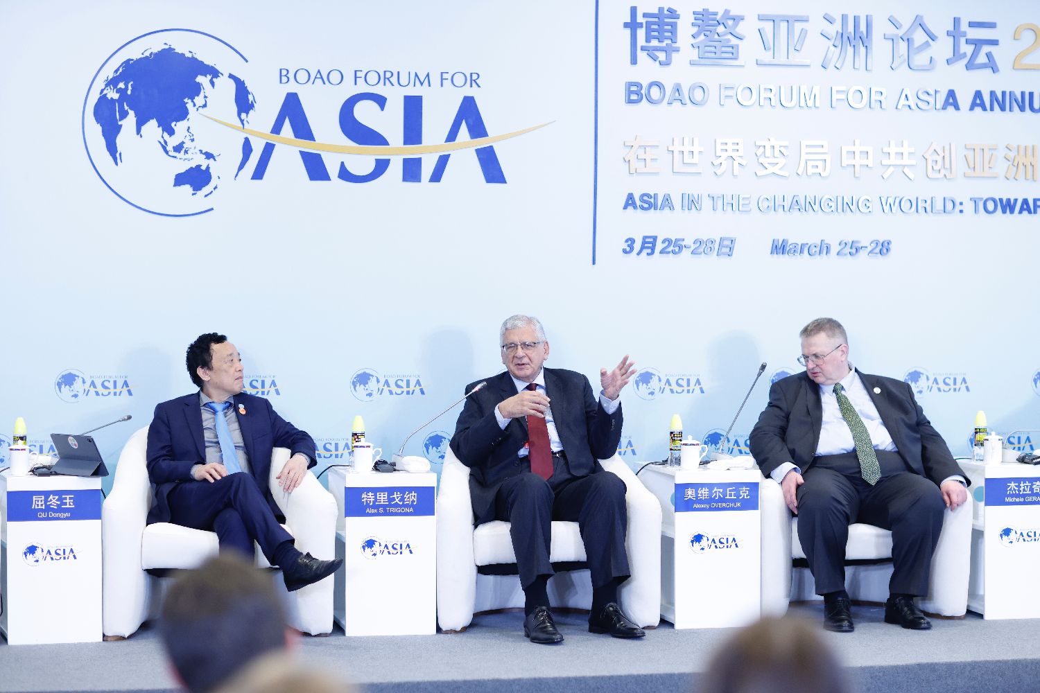 3月28日,博鳌亚洲论坛2025年年会“营造和平发展环境,维护共同经济安全”分论坛在海南博鳌举行。图为马耳他前外长亚历克斯·塞贝拉斯·特里戈纳(中)发言。中新社