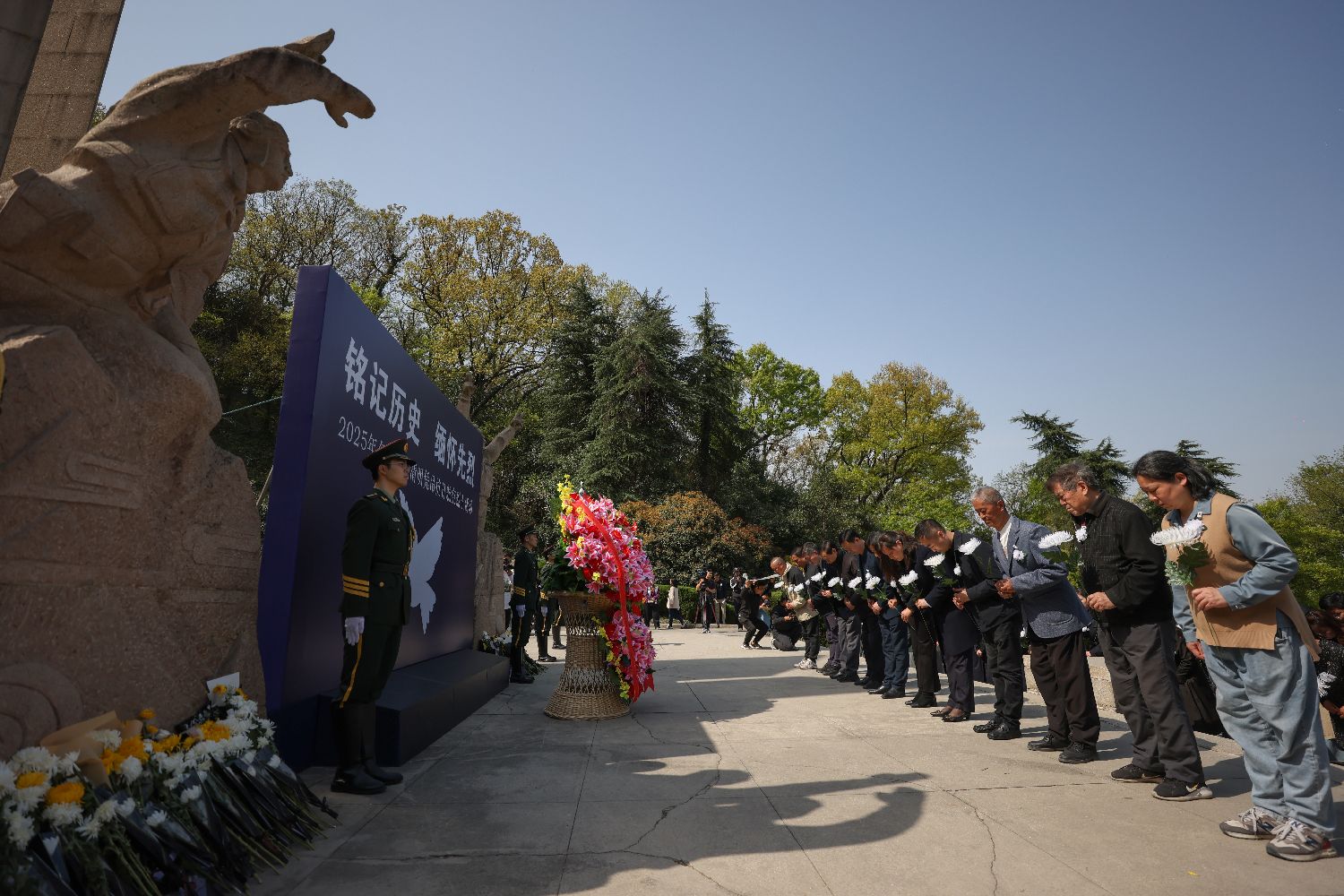 4月3日,“铭记历史缅怀先烈”2025年各界人士清明凭吊抗日航空英烈活动在位于南京抗日航空烈士纪念馆内的南京抗日航空烈士公墓举行,社会各界人士百余人集体缅怀抗日航空英烈。图为各界人士向南京抗日航空烈士纪念碑鞠躬,缅怀先烈。中新社记者泱波摄