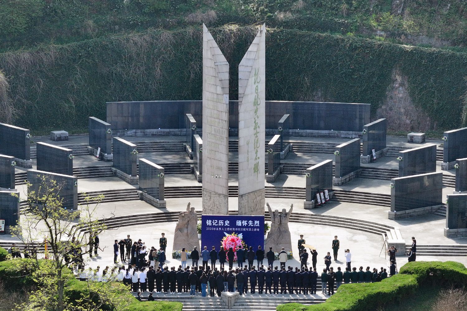 4月3日,“铭记历史缅怀先烈”2025年各界人士清明凭吊抗日航空英烈活动在位于南京抗日航空烈士纪念馆内的南京抗日航空烈士公墓举行,社会各界人士百余人集体缅怀抗日航空英烈。图为清明凭吊抗日航空英烈活动现场。(无人机照片)中新社记者泱波摄