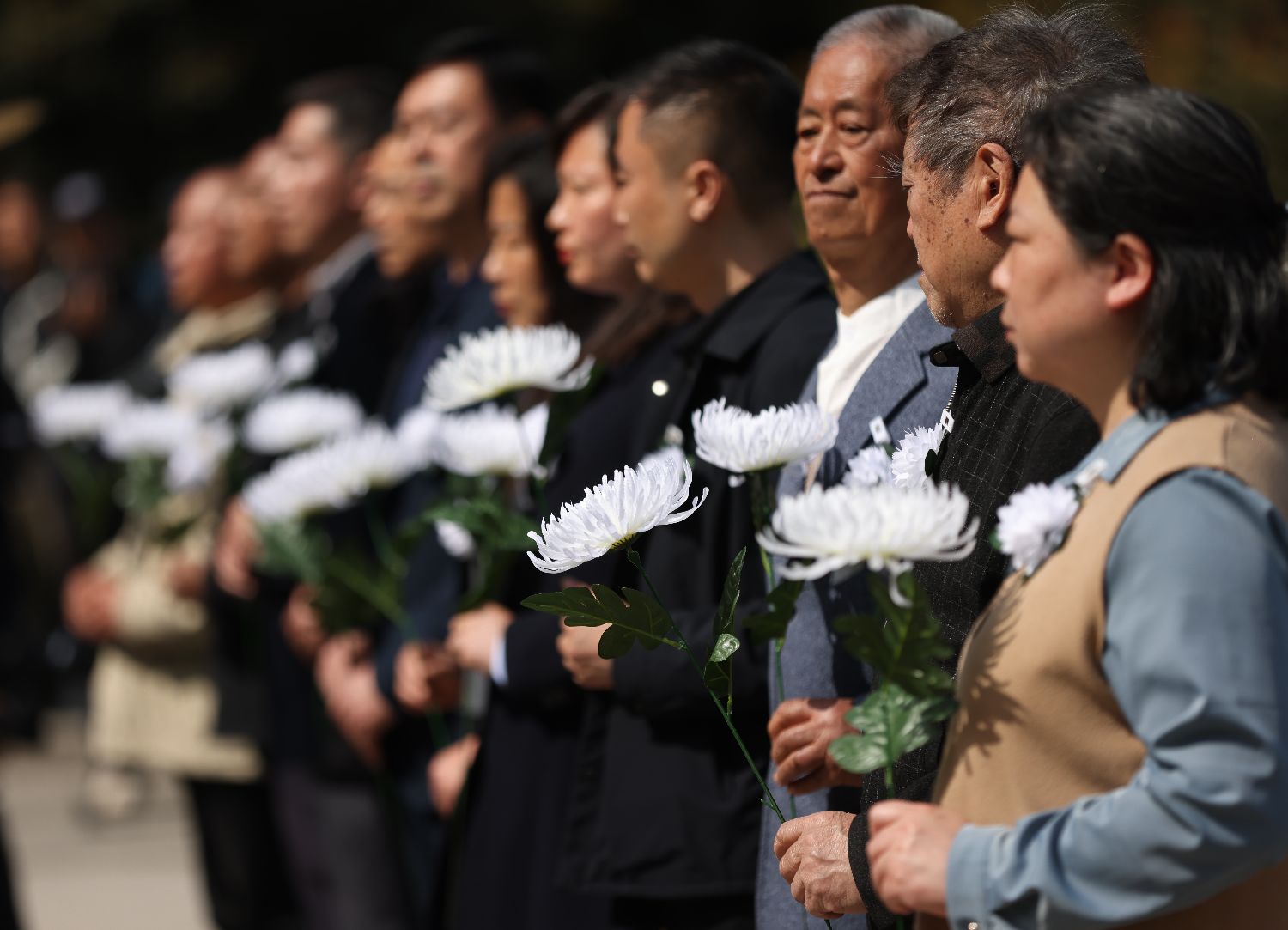 4月3日,“铭记历史缅怀先烈”2025年各界人士清明凭吊抗日航空英烈活动在位于南京抗日航空烈士纪念馆内的南京抗日航空烈士公墓举行,社会各界人士百余人集体缅怀抗日航空英烈。图为各界人士手持鲜花缅怀先烈。中新社记者泱波摄