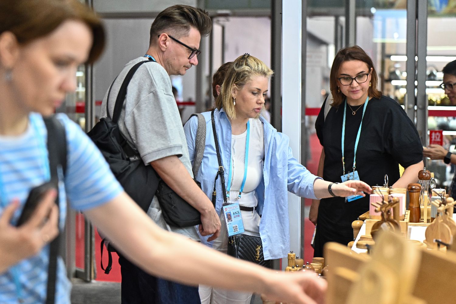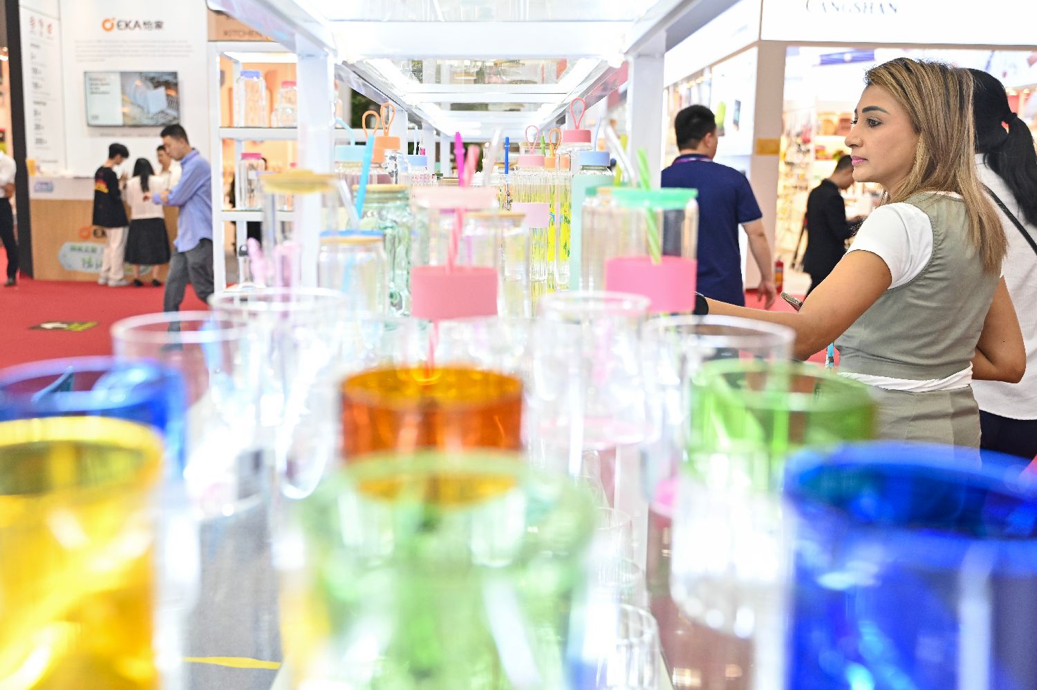 4月23日,第137届中国进出口商品交易会(广交会)第二期在广州开幕。本期展会以“品质家居”为主题,包括家庭用品、礼品及装饰品、建材及家具3个板块15个展区,线下展展览总面积51.5万平方米,展位数量24735个,参展企业10313家。图为采购商在餐厨用具展区挑选产品。中新社记者陈骥旻摄
