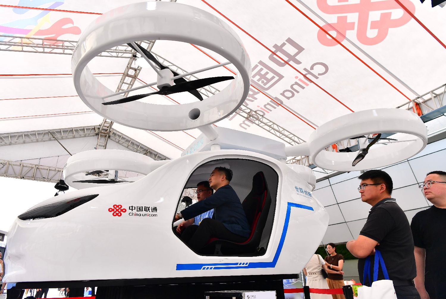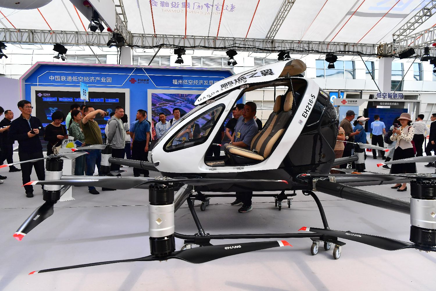 4月30日,亿航EH216-S吸引参观者。第八届数字中国建设峰会正在福建福州举行,本届峰会现场体验区首次设立低空经济专区,集中展示“数据要素+低空经济”的创新技术和应用。当前,低空经济正在逐渐融入民众的日常生活。中新社记者张斌摄