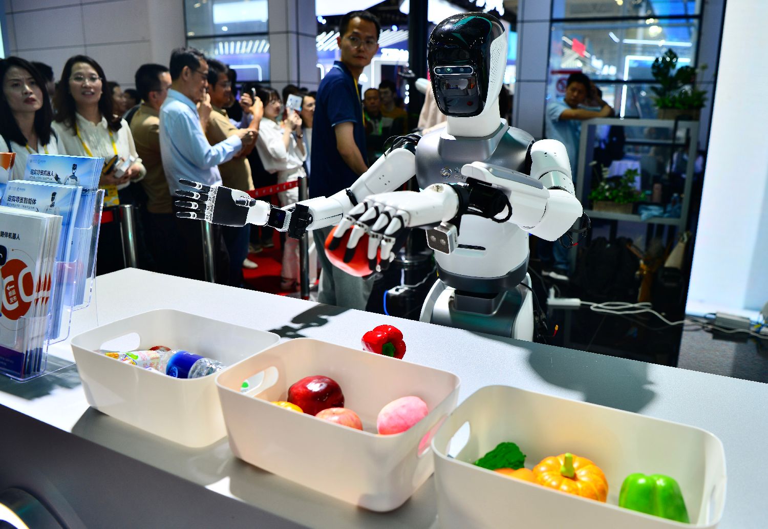 4月29日,峰会现场体验区展示的家庭服务型机器人吸引参观者。当日,第八届数字中国建设峰会在福建福州开幕。此次峰会主题是“二十五载奋进路数字中国谱新篇——数智引领高质量发展”。中新社记者张斌摄