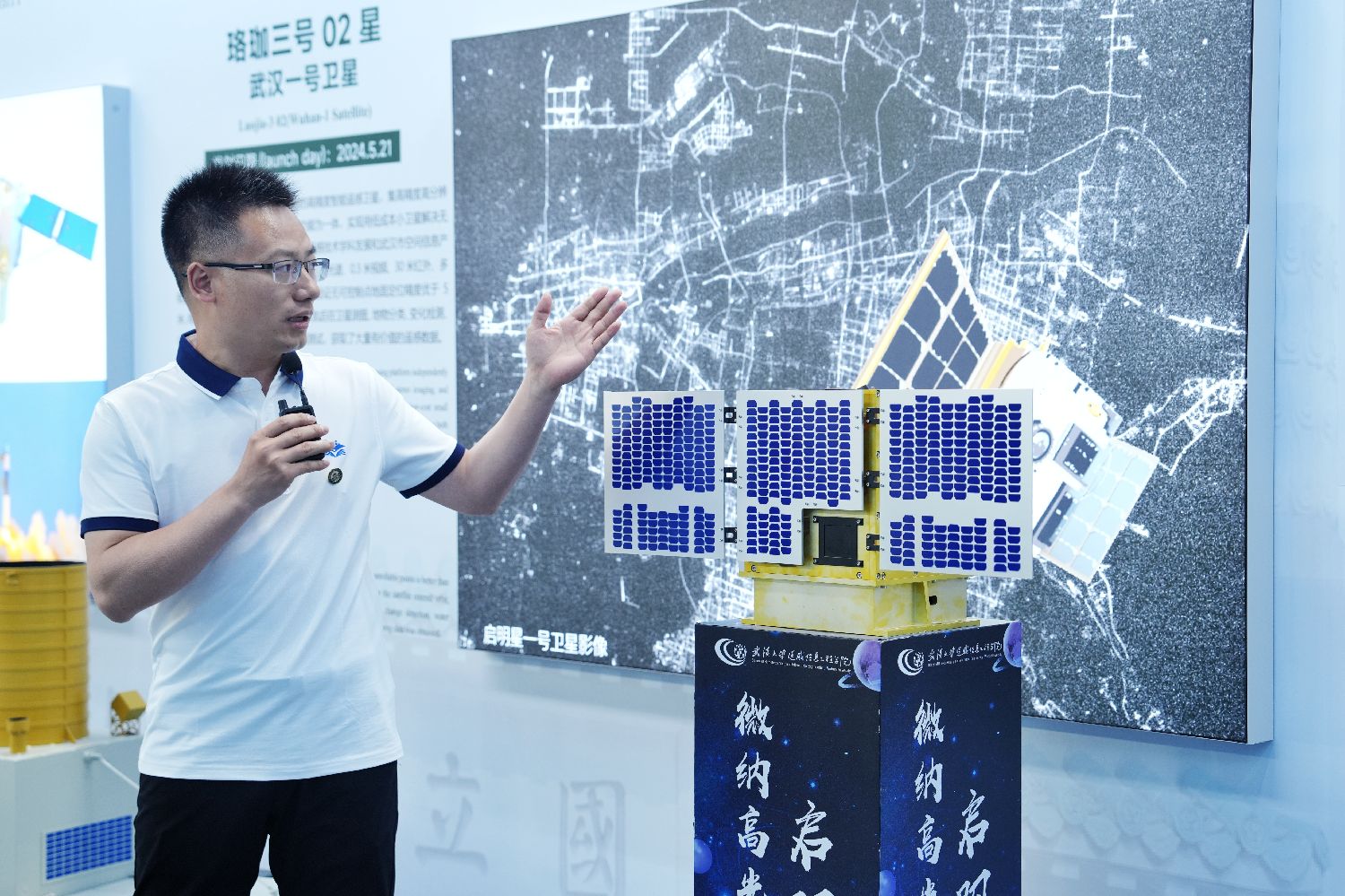 5月14日,湖北高等教育数字化成果展在武汉大学举办,多家湖北高校的智慧教育成果集中亮相。5月14日至16日,2025世界数字教育大会在湖北武汉举行。图为工作人员介绍武汉大学自主研制的“启明星一号”微纳卫星。中新社记者张祥毅摄