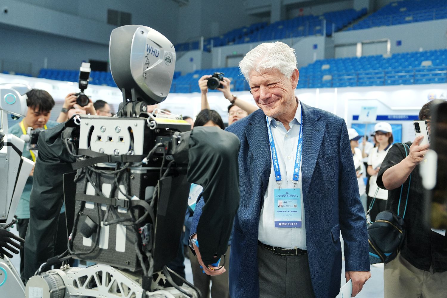 5月14日,湖北高等教育数字化成果展在武汉大学举办,多家湖北高校的智慧教育成果集中亮相。5月14日至16日,2025世界数字教育大会在湖北武汉举行。图为嘉宾与武汉大学研制的“天问”人形机器人握手。中新社记者张祥毅摄