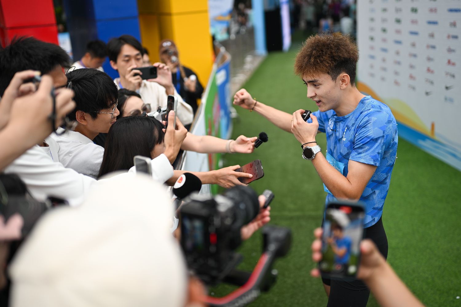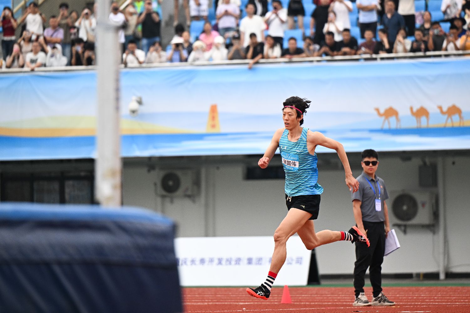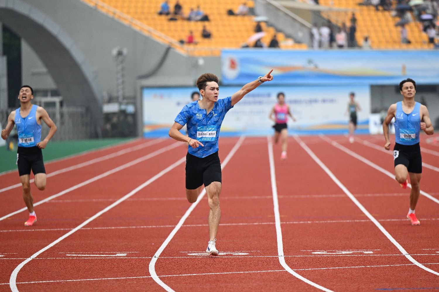 5月16日,在重庆市长寿区举行的第三届“一带一路”田径邀请赛暨2025年全国田径大奖赛(第3站)男子400米决赛中,新疆零阻力队选手艾力西尔·吾买尔以45秒77的成绩夺冠,山东中泰证券队选手刘凯、于德祥分获二、三名。图为艾力西尔·吾买尔在赛后接受媒体记者采访。中新社记者何蓬磊摄