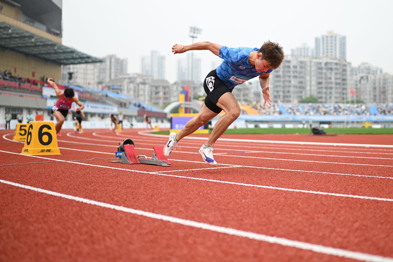 5月16日,在重庆市长寿区举行的第三届“一带一路”田径邀请赛暨2025年全国田径大奖赛(第3站)男子400米决赛中,新疆零阻力队选手艾力西尔·吾买尔以45秒77的成绩夺冠,山东中泰证券队选手刘凯、于德祥分获二、三名。图为艾力西尔·吾买尔在比赛中起跑。中新社记者何蓬磊摄