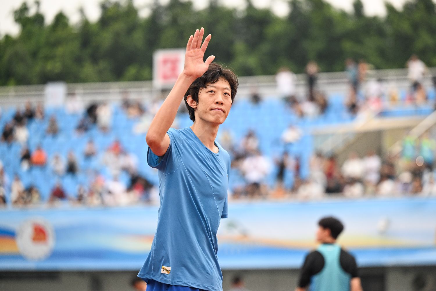 5月15日,在重庆市长寿区举行的第三届“一带一路”田径邀请赛暨2025年全国田径大奖赛(第3站)男子跳高决赛中,天津队选手张国伟以2米05的成绩位列第16。图为张国伟在赛前向观众致意。中新社记者何蓬磊摄