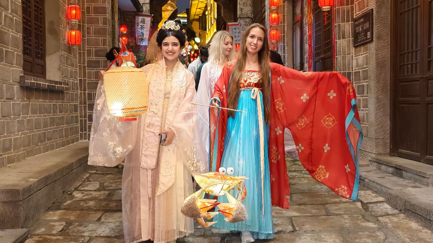 5月15日,江西九江庐山市,参加洋网红“DiscoverJiangXi”庐山行活动的多国“洋网红”走进庐山脚下的庐山花语世界、方块猫艺术村、流星山公园、西宁老街等地参观采风。图为“洋网红”们在西宁老街身着中国传统服饰汉服夜游。中新社记者刘占昆摄