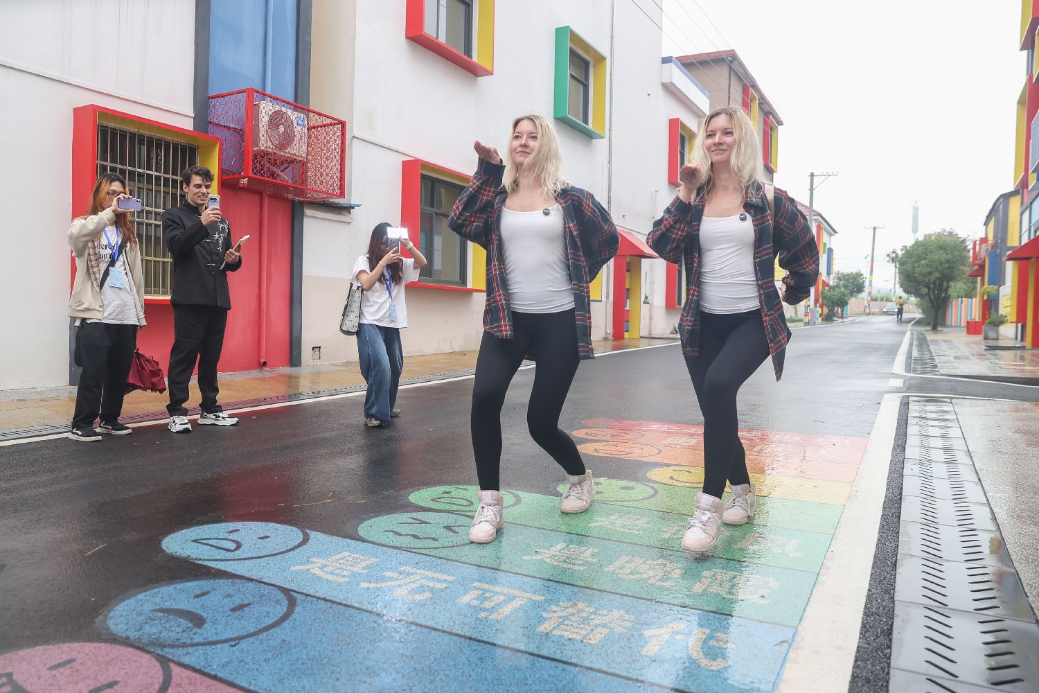 5月15日,江西九江庐山市,参加洋网红“DiscoverJiangXi”庐山行活动的多国“洋网红”走进庐山脚下的庐山花语世界、方块猫艺术村、流星山公园、西宁老街等地参观采风。图为来自俄罗斯的双胞胎网红“毛毛姐妹”在方块猫艺术村拍摄视频。中新社记者刘力鑫摄