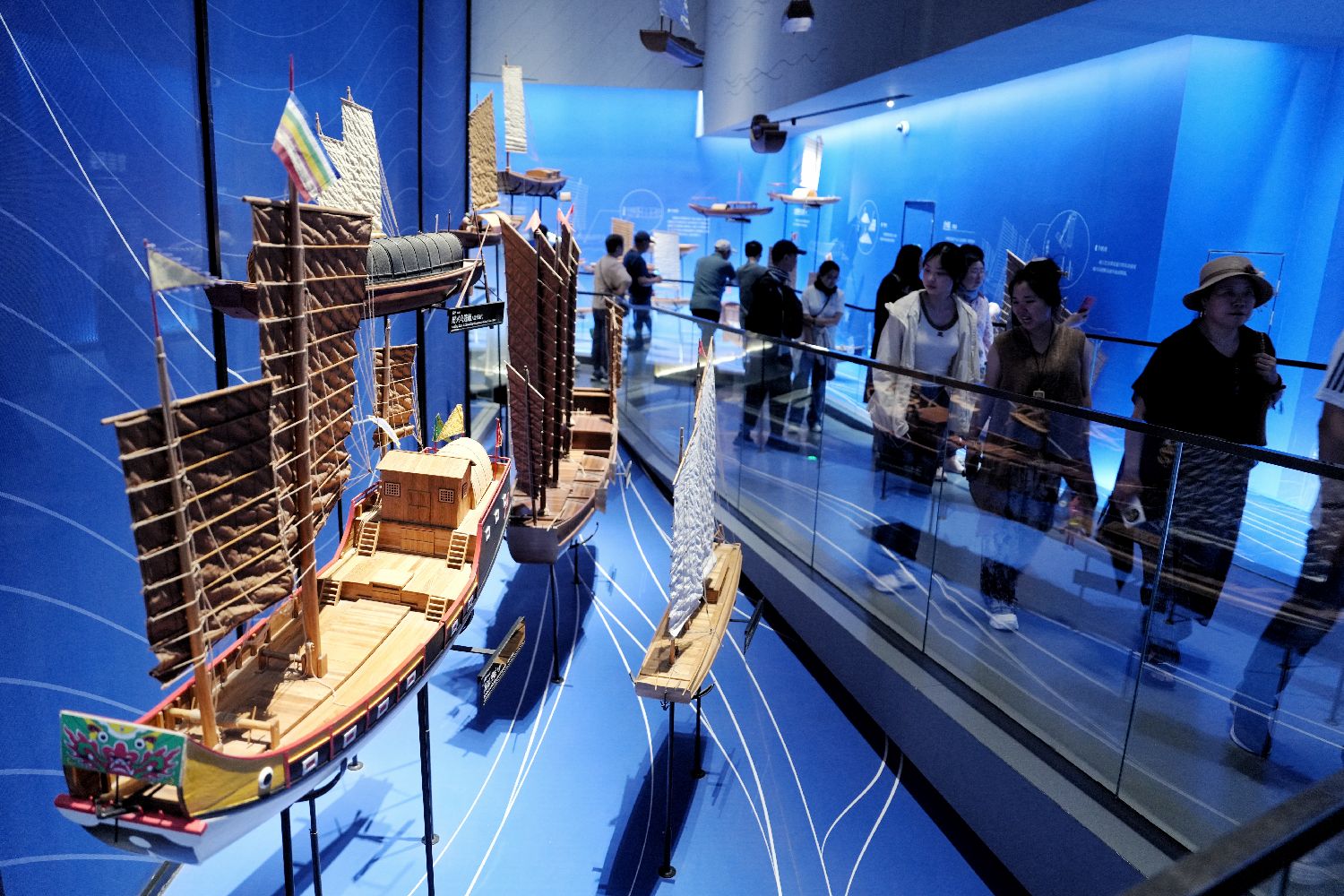 5月20日,观众在江苏扬州中国大运河博物馆参观运河舟楫模型。据了解,中国大运河博物馆是集运河文物收藏、展示、研究、教育于一体,兼顾旅游休闲与对外交流的专题性博物馆,是大运河国家文化公园建设的标志性博物馆。(无人机照片)中新社记者张祥毅摄