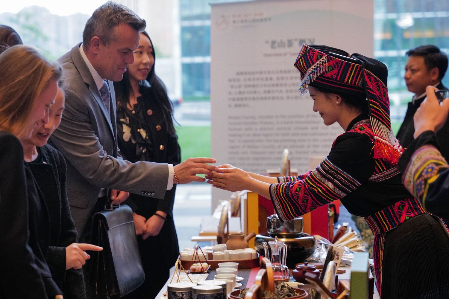 当地时间5月21日,中国常驻联合国代表团在纽约联合国总部举行主题活动庆祝第六个“国际茶日”。图为来宾在现场体验民俗项目。中新社记者王帆摄