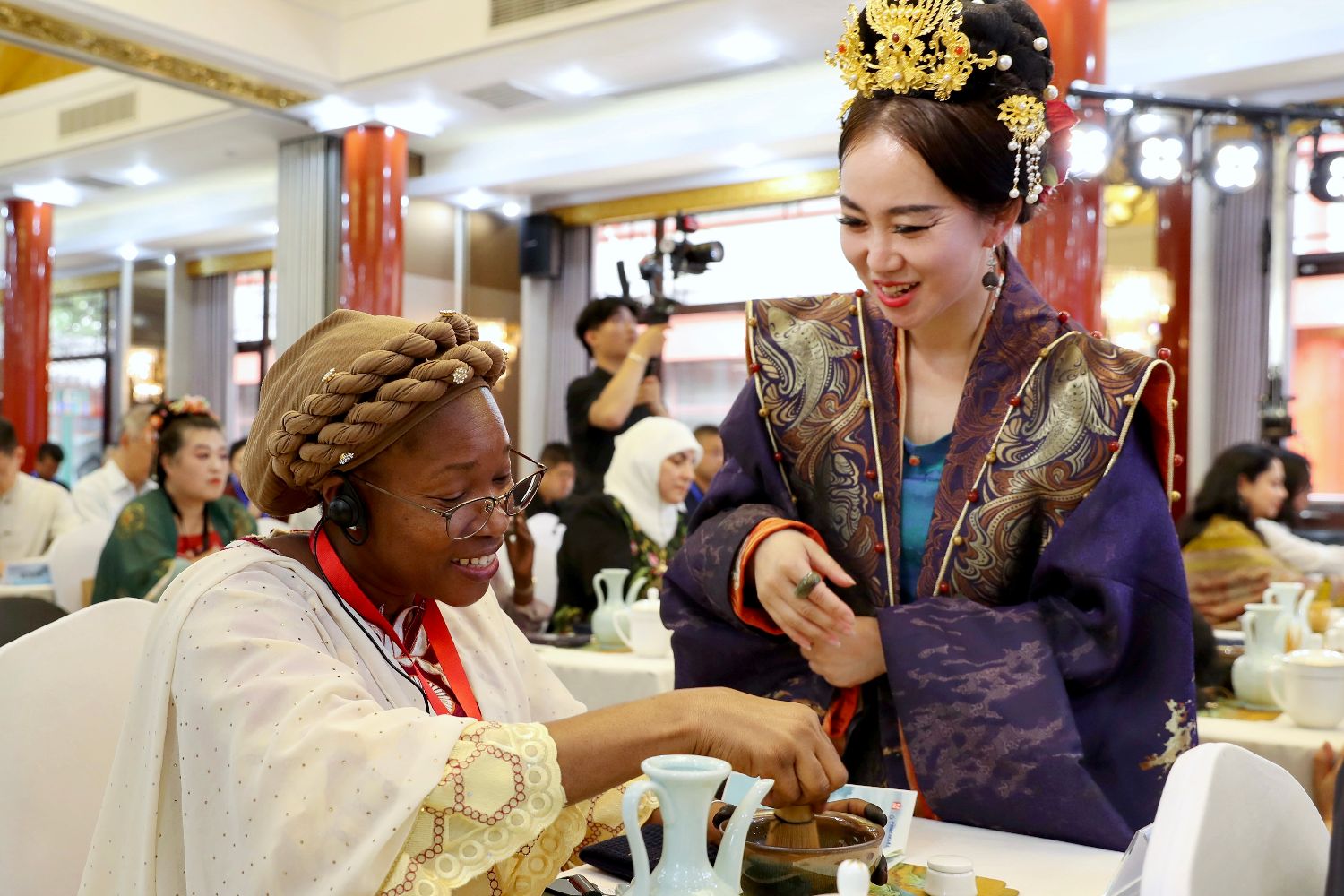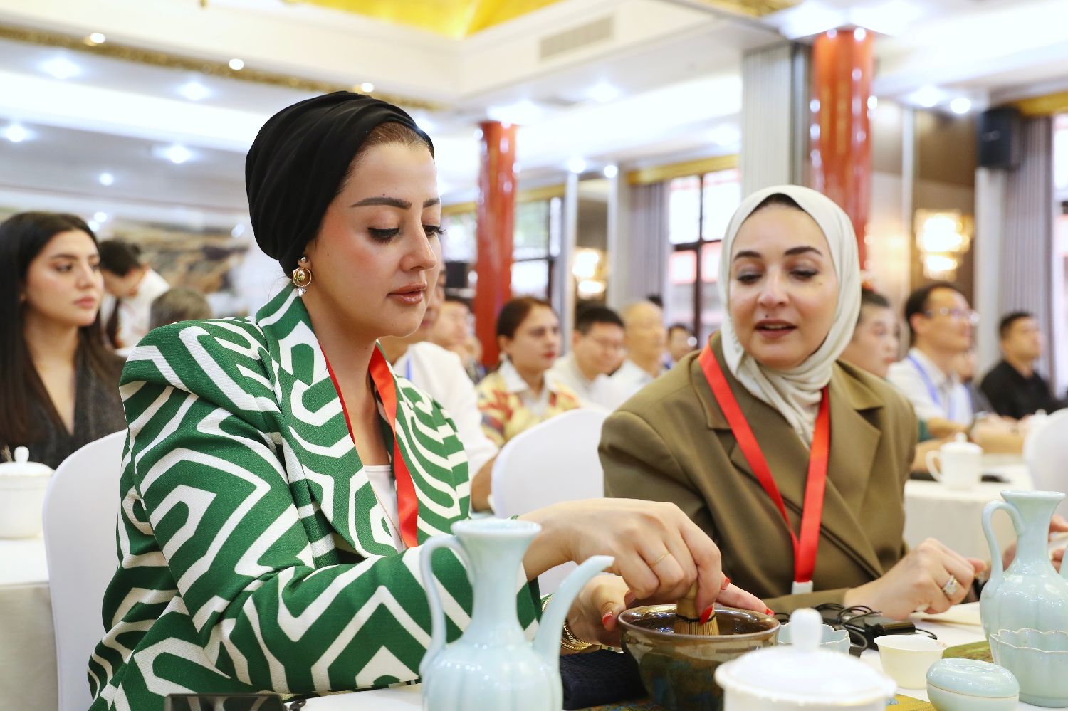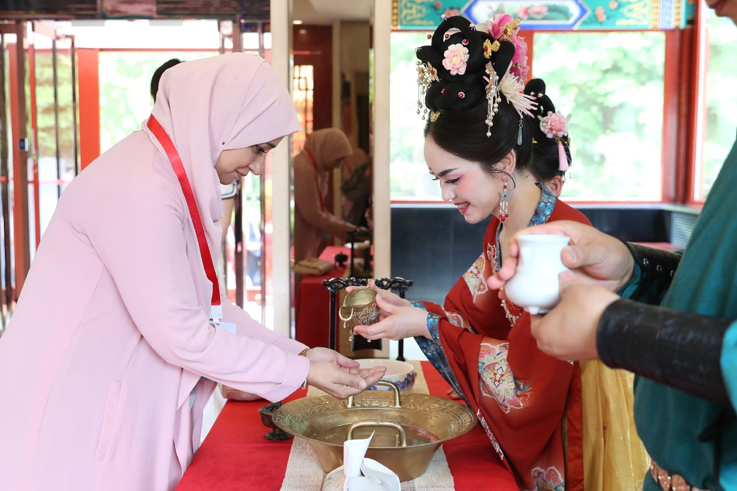 5月21日是“国际茶日”,中国国家创新与发展战略研究会与中国科学院大学国际学院在北京共同主办了521国际茶日主题活动。活动以“焕新·开放·共生”为主题,主要分为茶艺表演、中国传统文化展示、主题沙龙、圆桌对话等环节,让越来越多的外国友人在茶文化中“读懂中国”。图为巴基斯坦驻中国大使夫人玛丽亚姆·马哈茂德在活动现场体验盥洗礼。中新社记者王紫儒摄