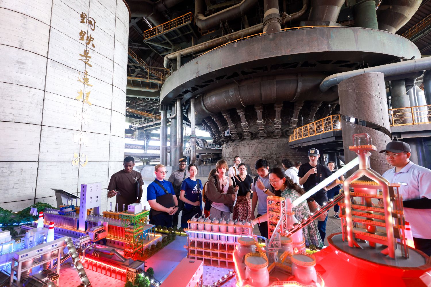 5月26日,北京工业大学的留学生来到北京首钢园参观,学习了解首钢工业遗存再利用和北京城市更新的现状。图为留学生们在三高炉内部参观。中新社记者贾天勇摄