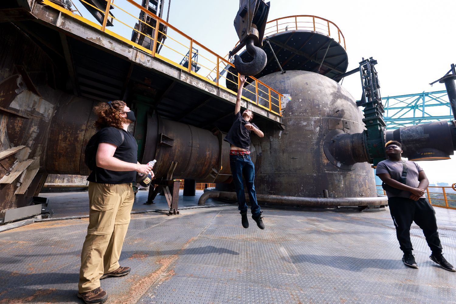5月26日,北京工业大学的留学生来到北京首钢园参观,学习了解首钢工业遗存再利用和北京城市更新的现状。图为一名留学生尝试跳起摸到一只起重钩。中新社记者贾天勇摄
