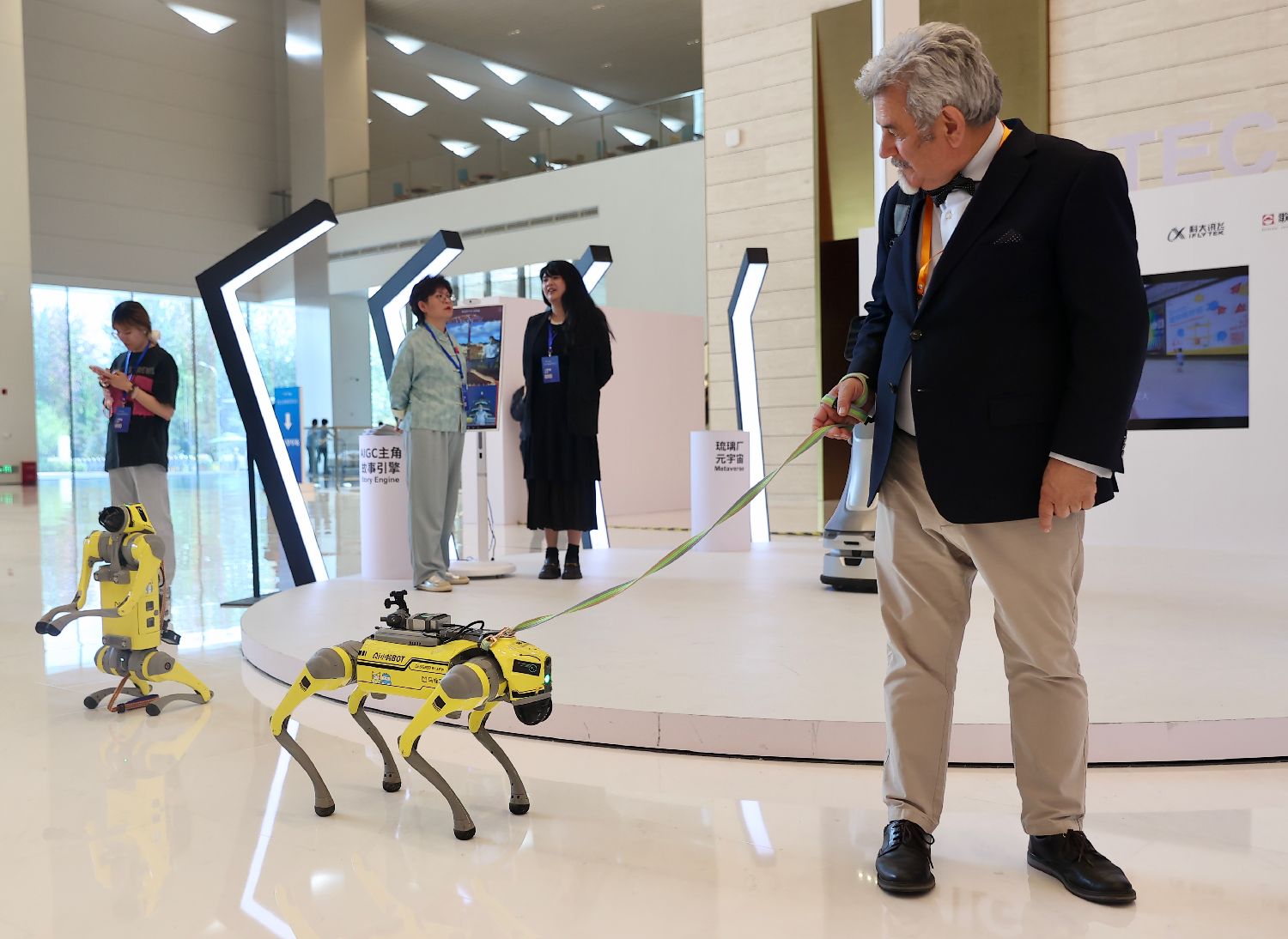 6月3日,2025北京入境旅游发展大会在北京开幕。会上介绍,今年1月至4月,北京共接待入境游客146.0万人次,同比增长57.1%;实现旅游花费19.0亿美元,同比增长55.0%。图为参会嘉宾在“遛”机械狗。中新社记者易海菲摄
