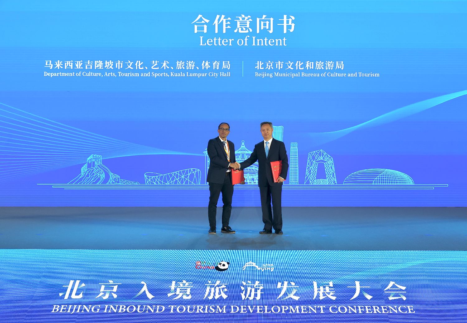 6月3日,2025北京入境旅游发展大会在北京开幕。会上介绍,今年1月至4月,北京共接待入境游客146.0万人次,同比增长57.1%;实现旅游花费19.0亿美元,同比增长55.0%。图为北京市文化和旅游局与马来西亚吉隆坡市文化、艺术、旅游和体育局签署合作意向书,未来将在宣传推广、文化活动等方面加强合作。中新社记者易海菲摄