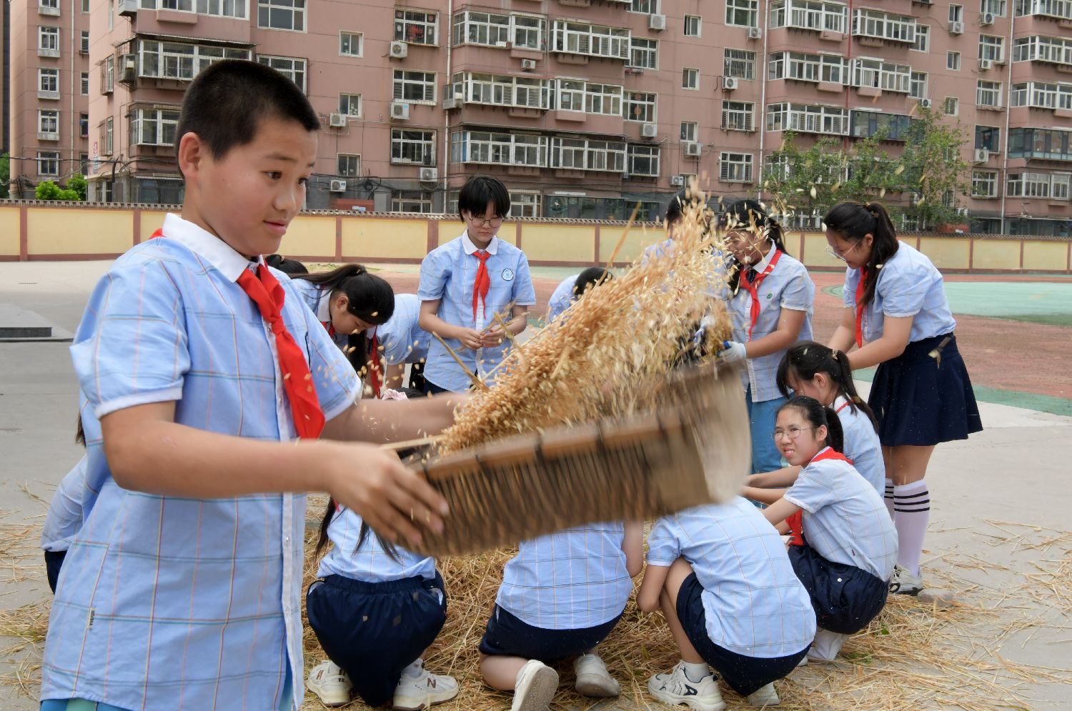 6月5日,河北省石家庄市塔谈小学的学生体验小麦收获的过程。当日迎来二十四节气中的第九个节气——芒种,该校开展芒种主题相关实践活动,让孩子们感受传统农耕文化的魅力。中新社记者翟羽佳摄