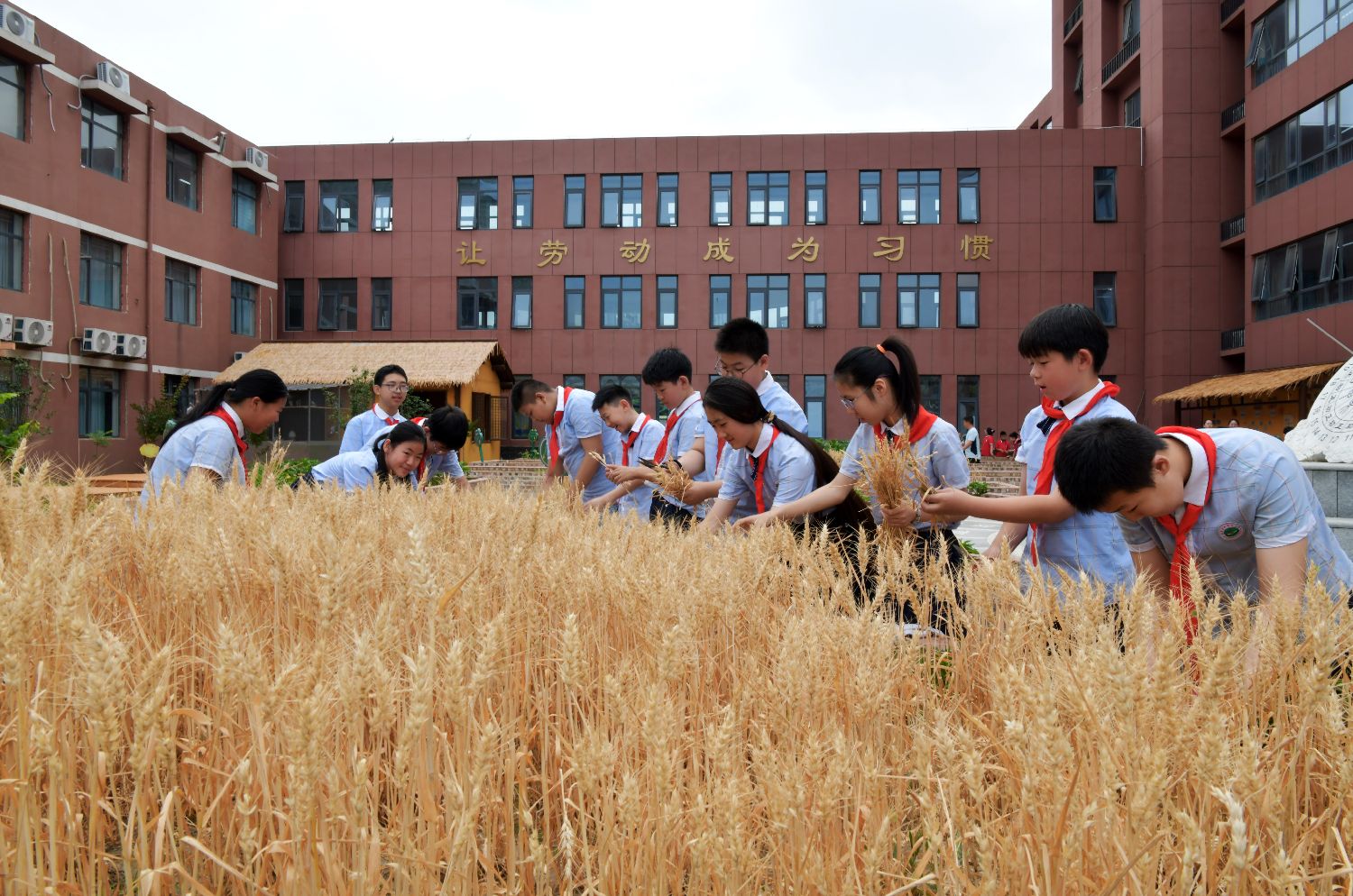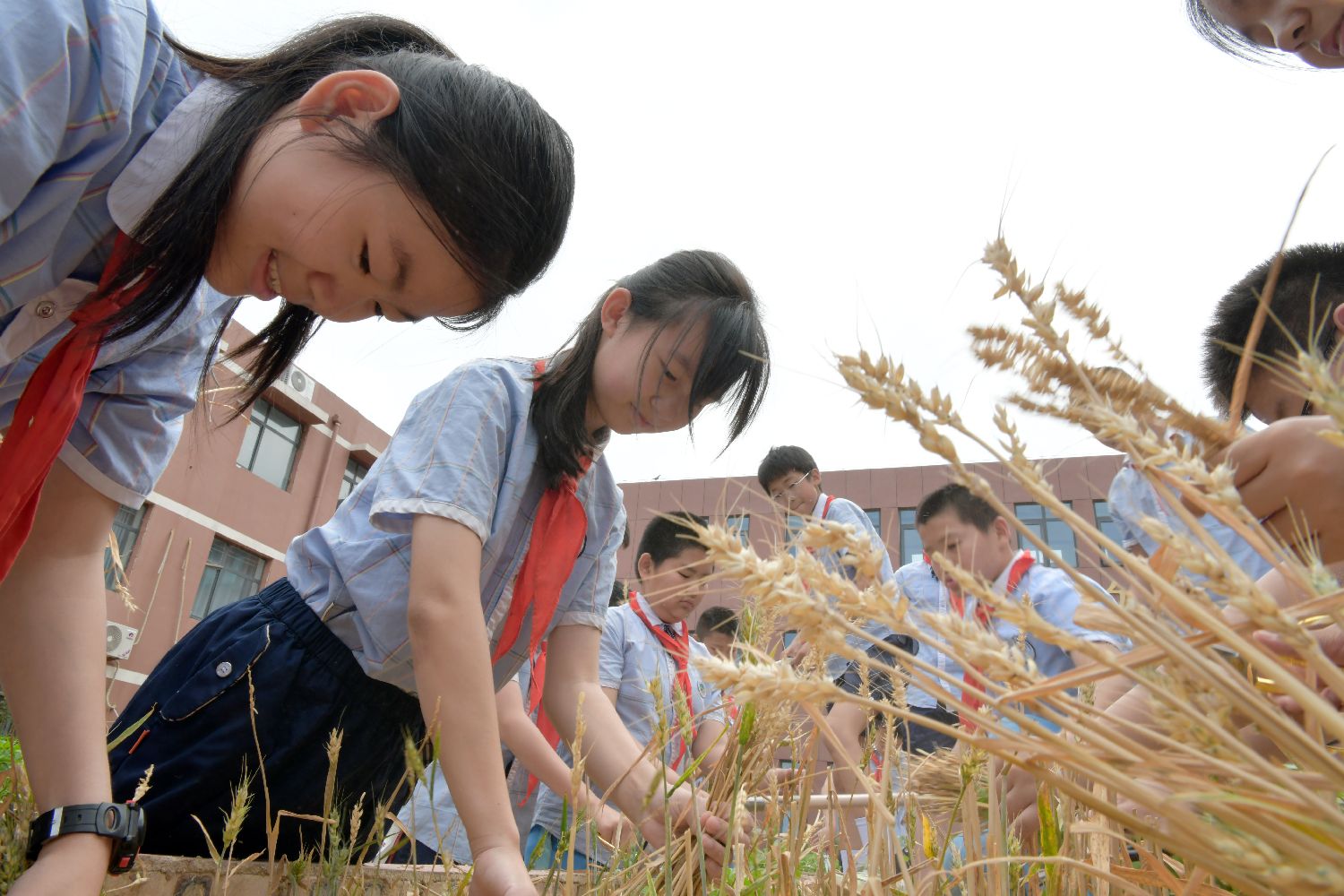 6月5日,河北省石家庄市塔谈小学的学生收获小麦。当日迎来二十四节气中的第九个节气——芒种,该校开展芒种主题相关实践活动,让孩子们感受传统农耕文化的魅力。中新社记者翟羽佳摄