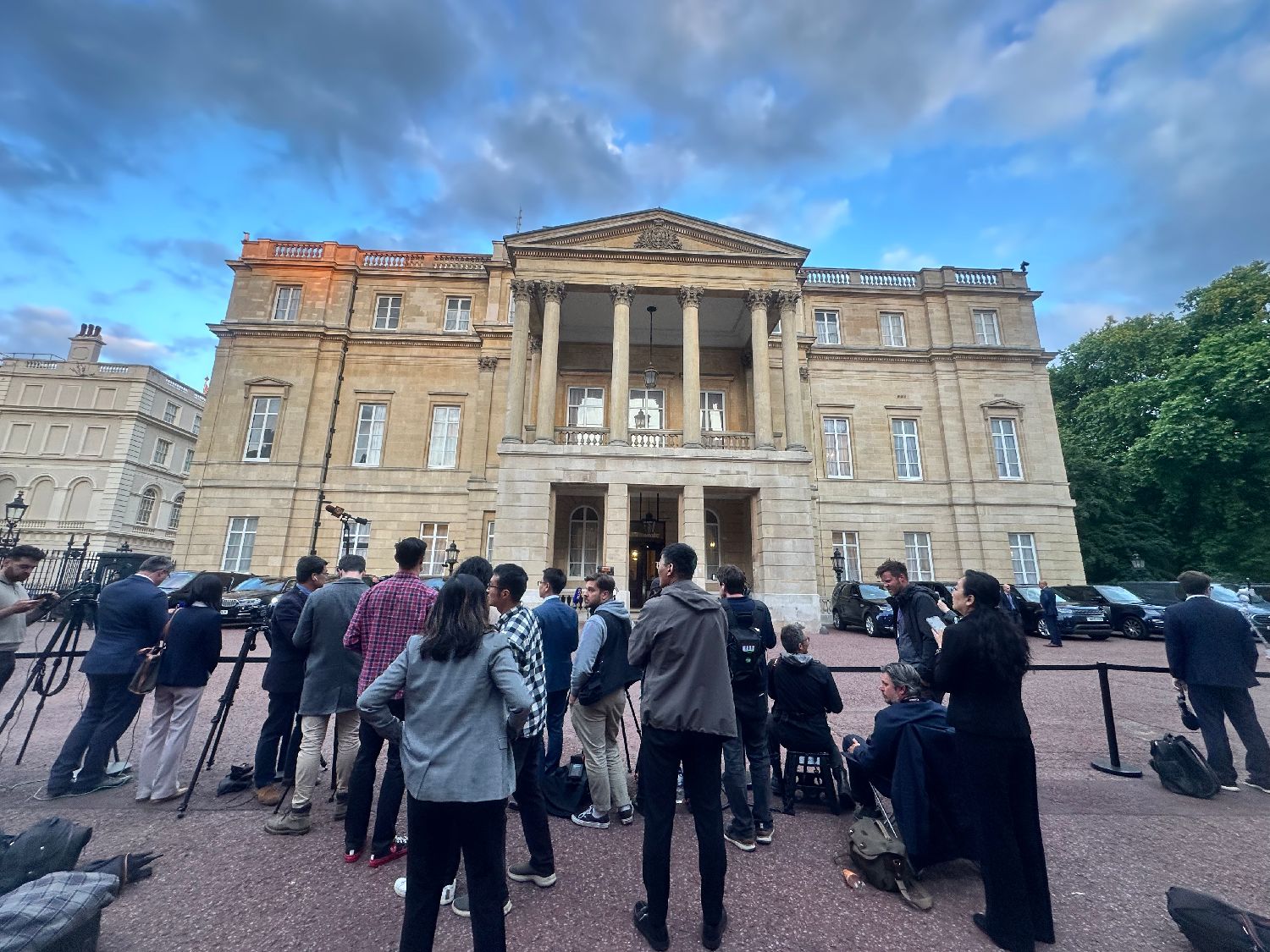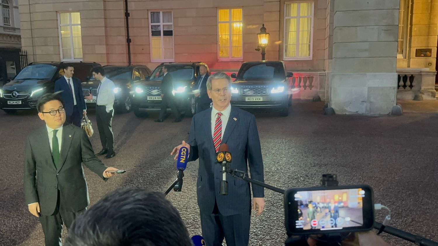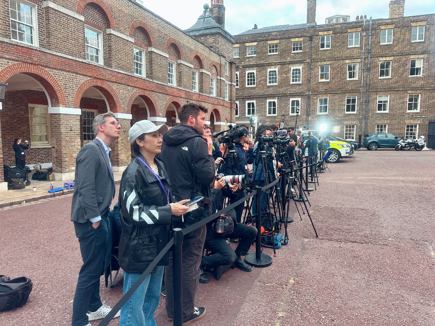 当地时间6月9日至10日,中美经贸中方牵头人、中国国务院副总理何立峰与美方牵头人、美国财政部长贝森特及商务部长卢特尼克、贸易代表格里尔在英国伦敦举行中美经贸磋商机制首次会议。图为在兰卡斯特宫外守候的媒体记者。