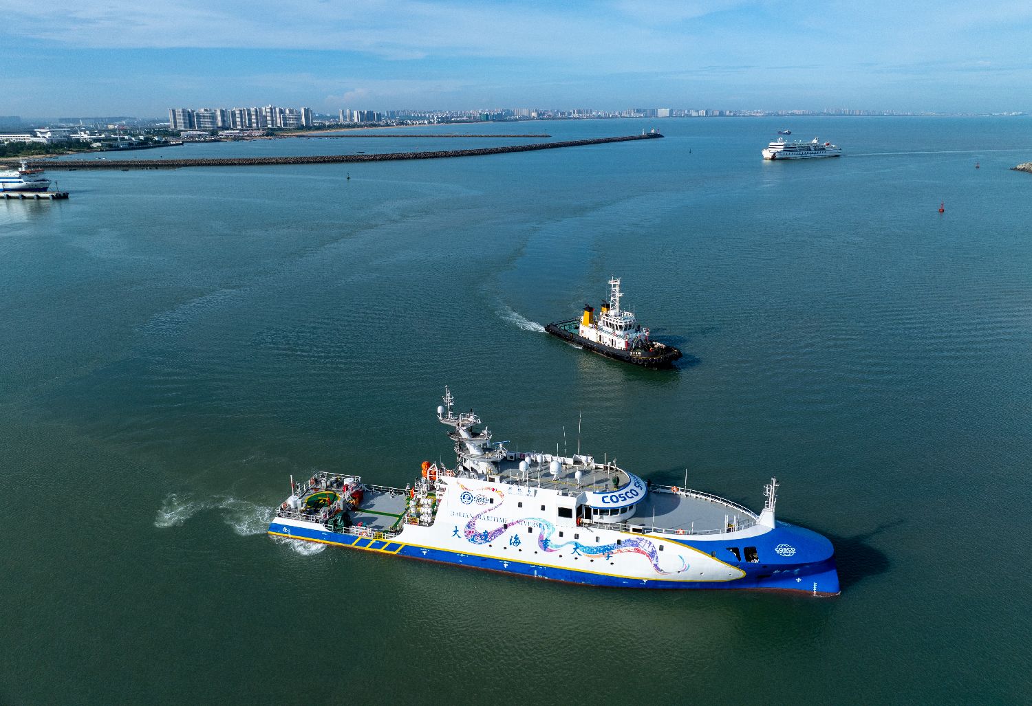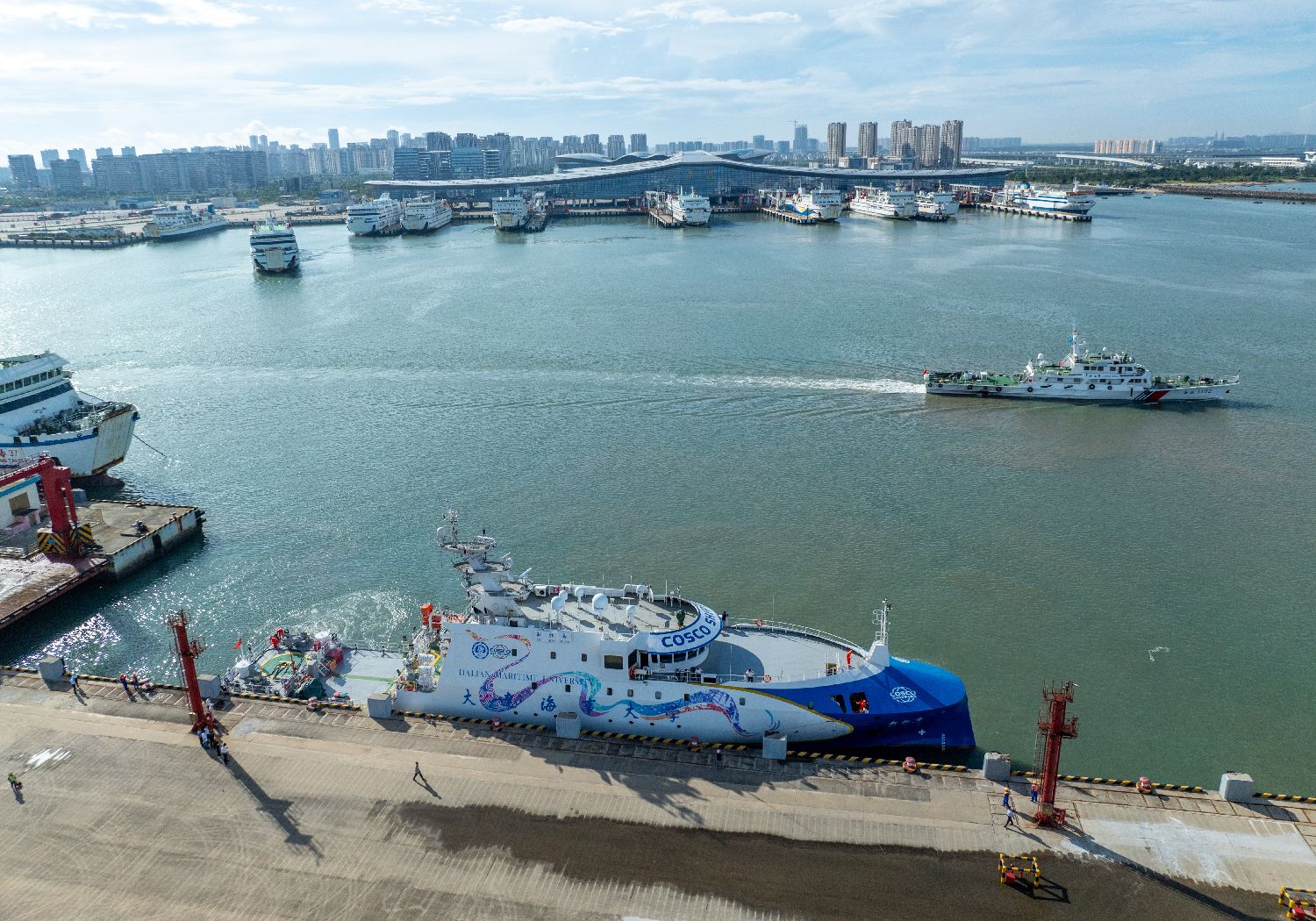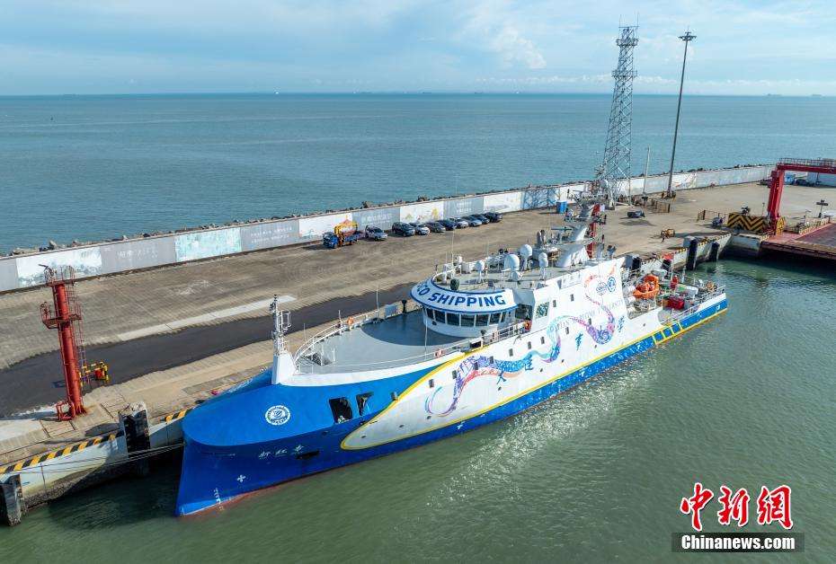 “新红专”抵琼后,将于7月2日至12日在海口新海港、儋州洋浦港、琼海龙湾港进行巡展,聚焦智能技术演示,涵盖自主航行、自动靠泊等科目。(图片来源:中新社)