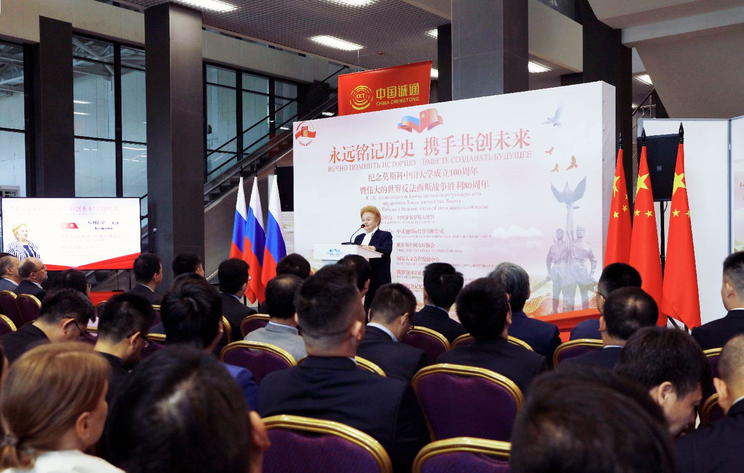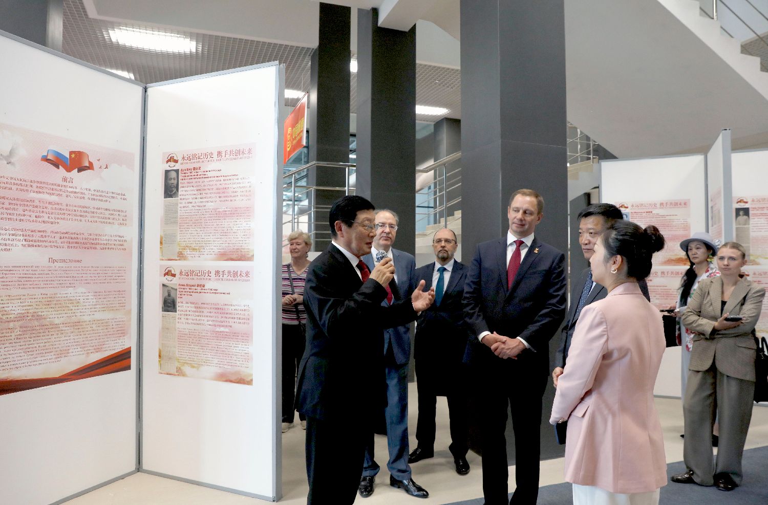 当地时间7月2日,“永远铭记历史携手共创未来”主题展在莫斯科格林伍德会展中心开幕,纪念世界反法西斯战争胜利80周年暨莫斯科中山大学成立100周年。图为嘉宾致辞。(图片来源:本文图片均自中新社)