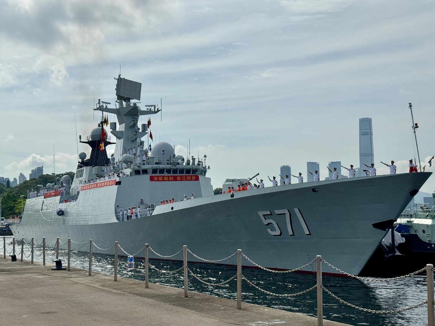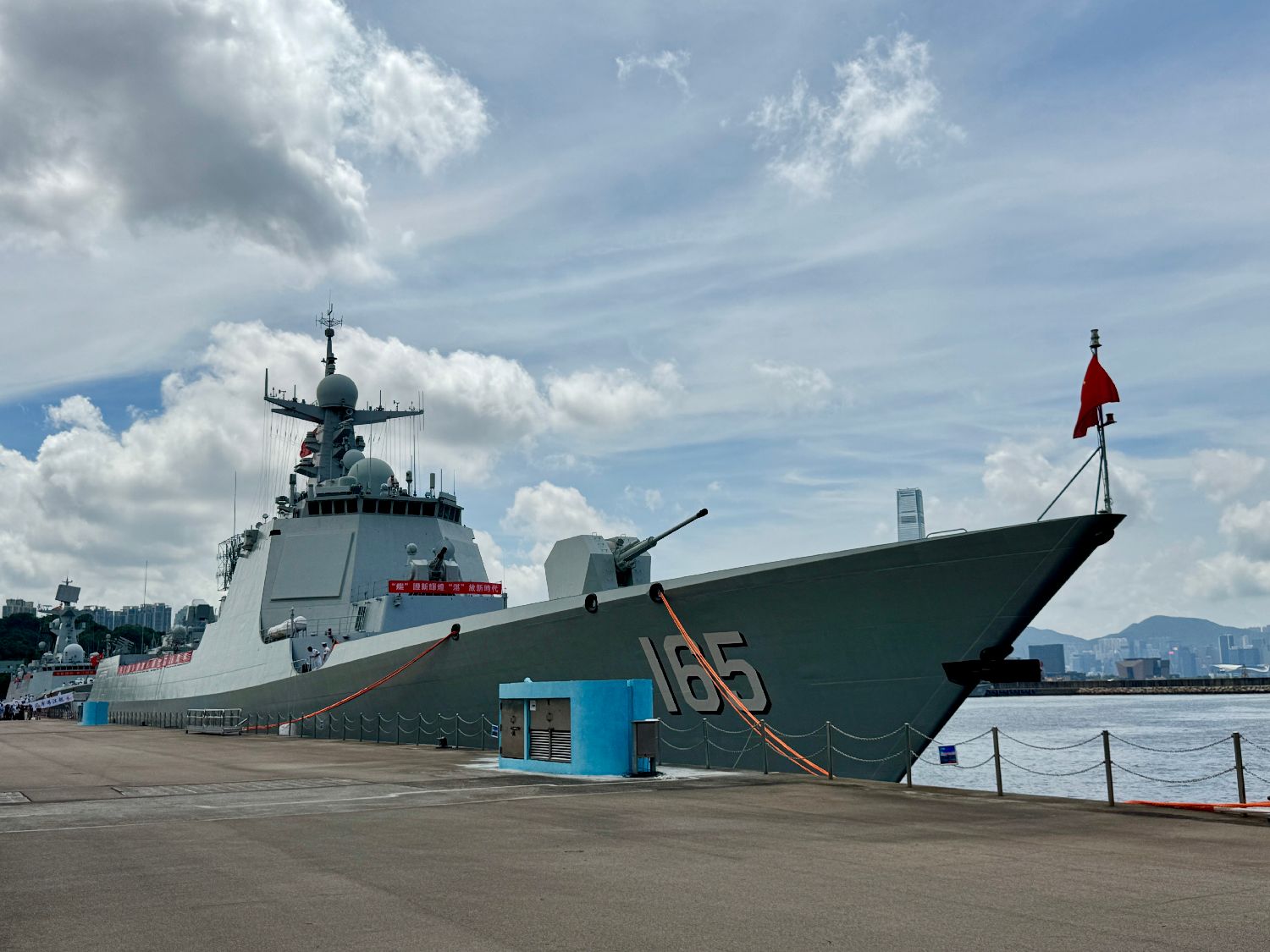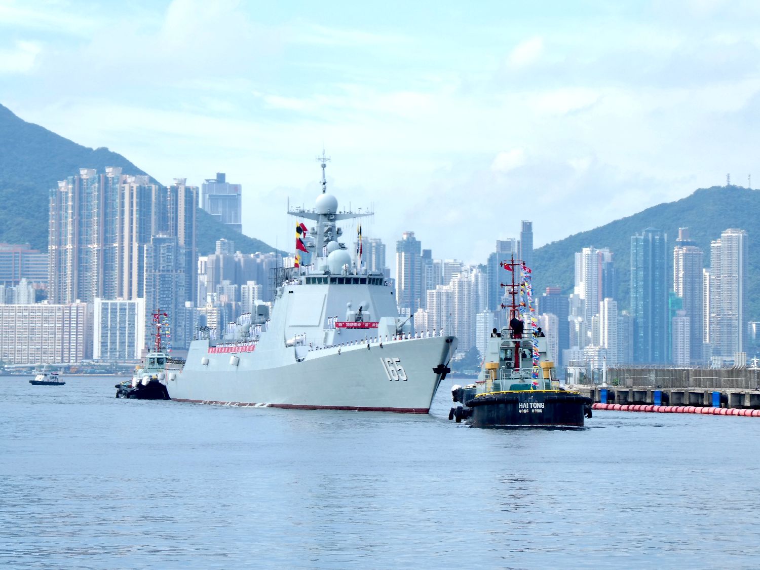 7月3日,中国人民解放军海军山东舰航母编队抵达香港特区,开启为期5天的访问活动。当天上午,编队属舰湛江舰、运城舰停靠昂船洲军营码头。图为运城舰靠泊昂船洲军营码头。(图片来源:中新社/戴梦岚 摄)