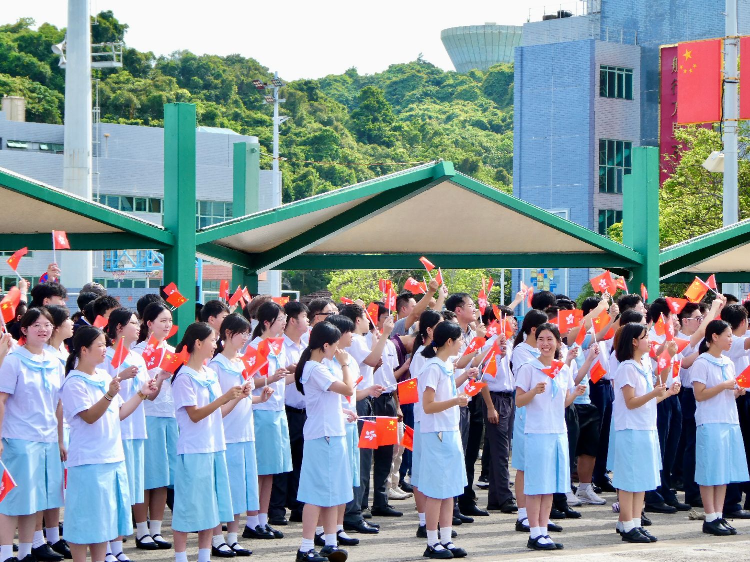 香港青少年挥舞国旗和香港特区区旗,欢迎湛江舰和运城舰。(图片来源:中新社/戴梦岚 摄)