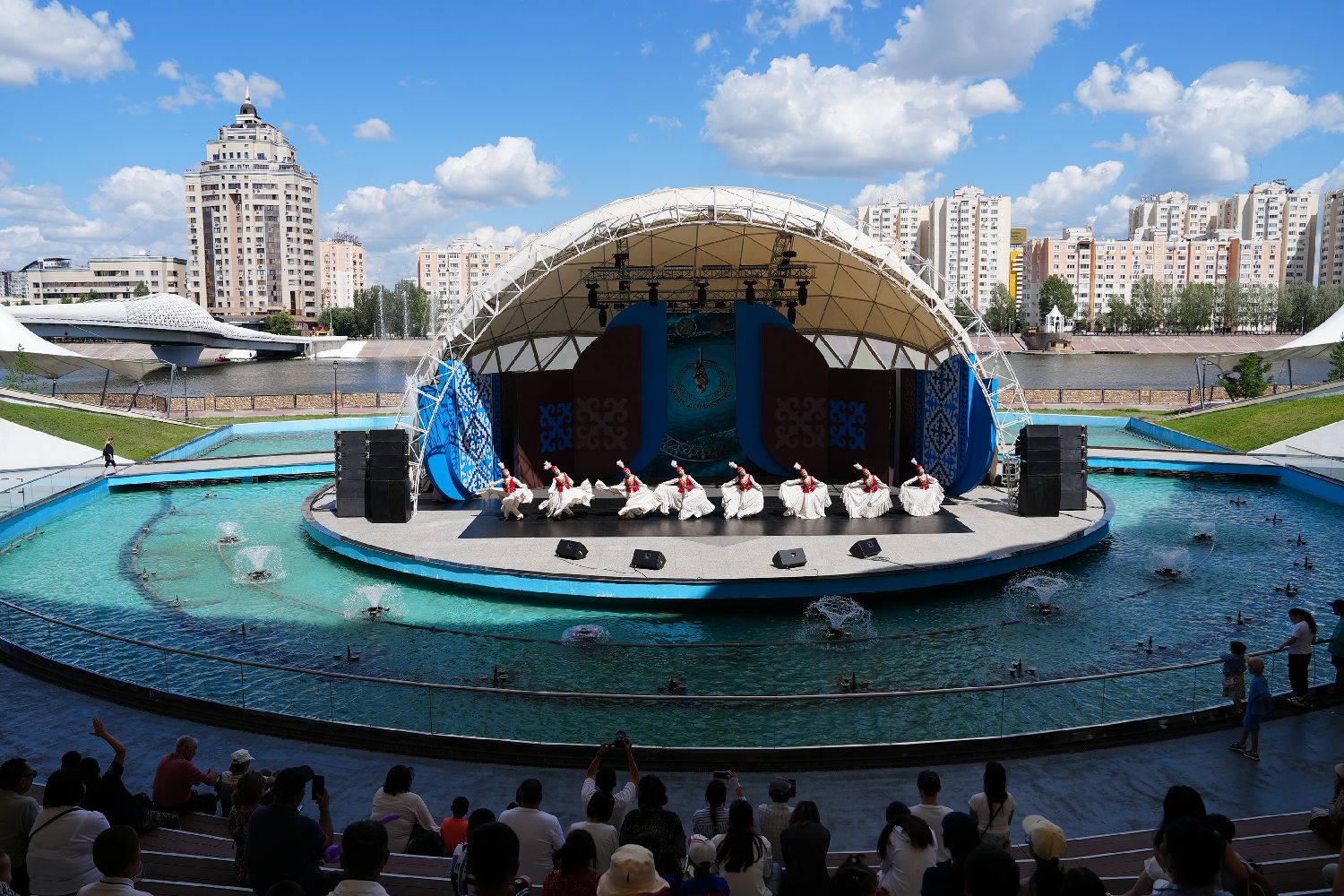 当地时间7月6日,哈萨克斯坦阿斯塔纳市举办多场文化和体育活动庆祝首都日。图为演员在伊希姆河畔圆形剧场进行舞蹈表演。(图片来源:本文图片均自中新社)