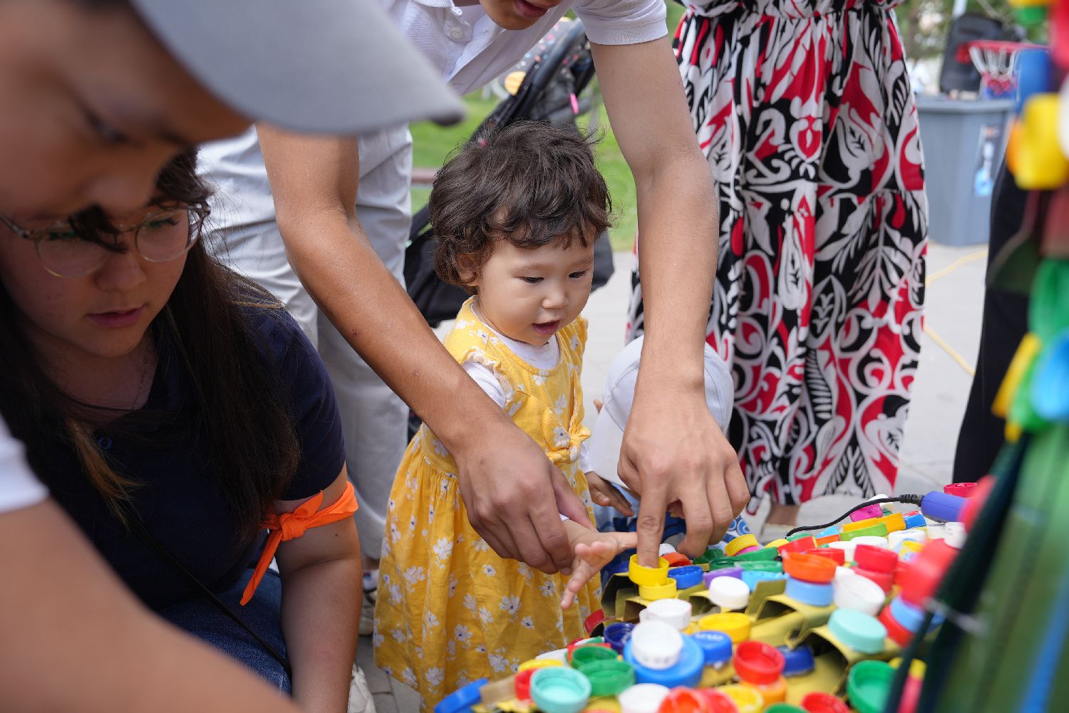 当地时间7月6日,一名小女孩在家长陪伴下,参与中央公园内的环保互动游戏。