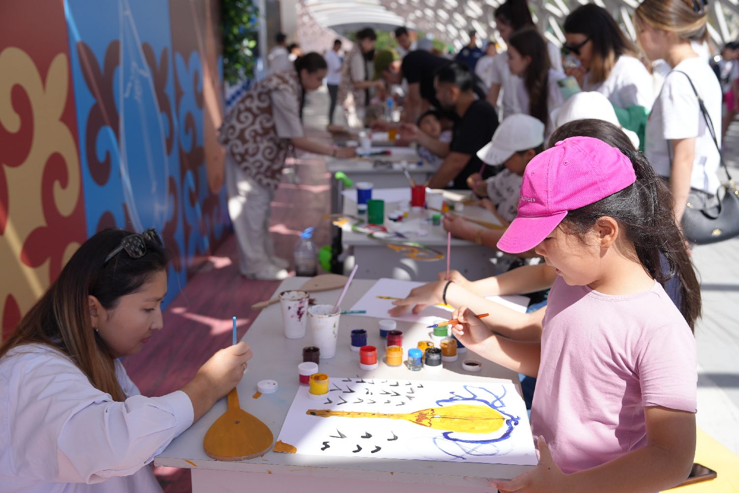 在城市地标阿特劳桥上开设绘画体验区,孩子们用彩笔绘制传统乐器图案。