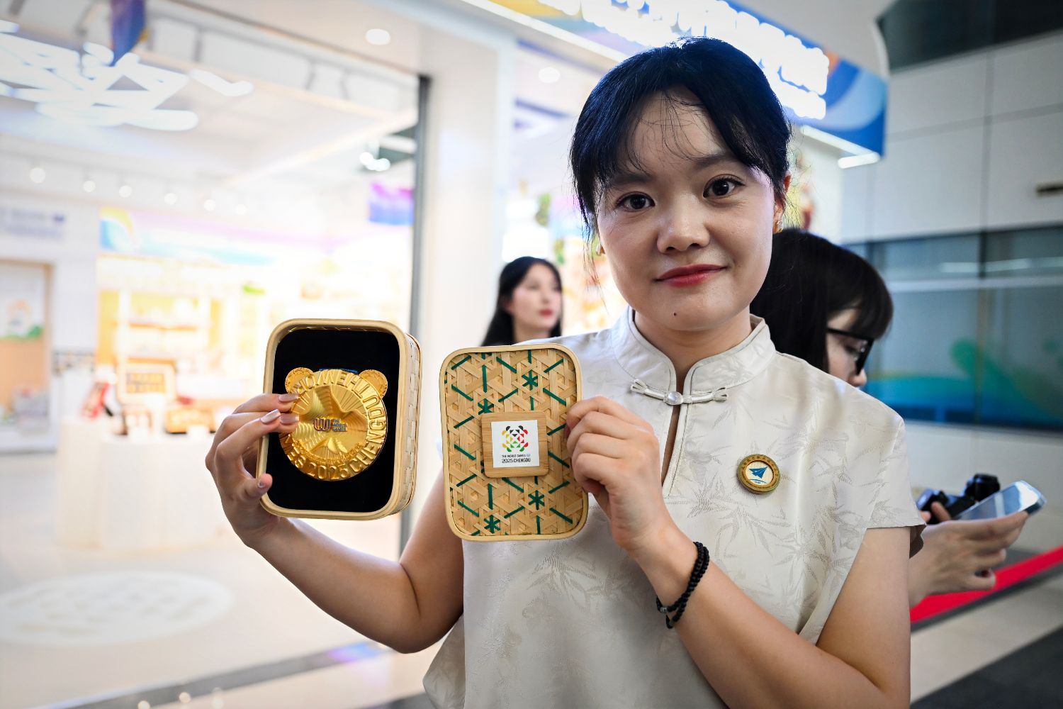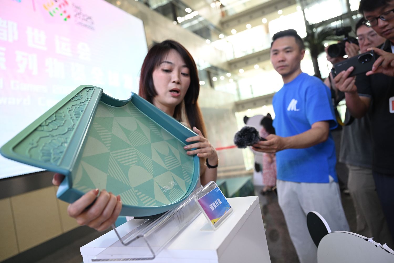 7月8日,2025年第12届世界运动会(成都世运会)颁奖仪式系列物资设计在成都亮相,颁奖礼服、纪念品等悉数亮相。图为设计师杨青云展示其设计的竹编奖牌包装盒。(图片来源:中新社)
