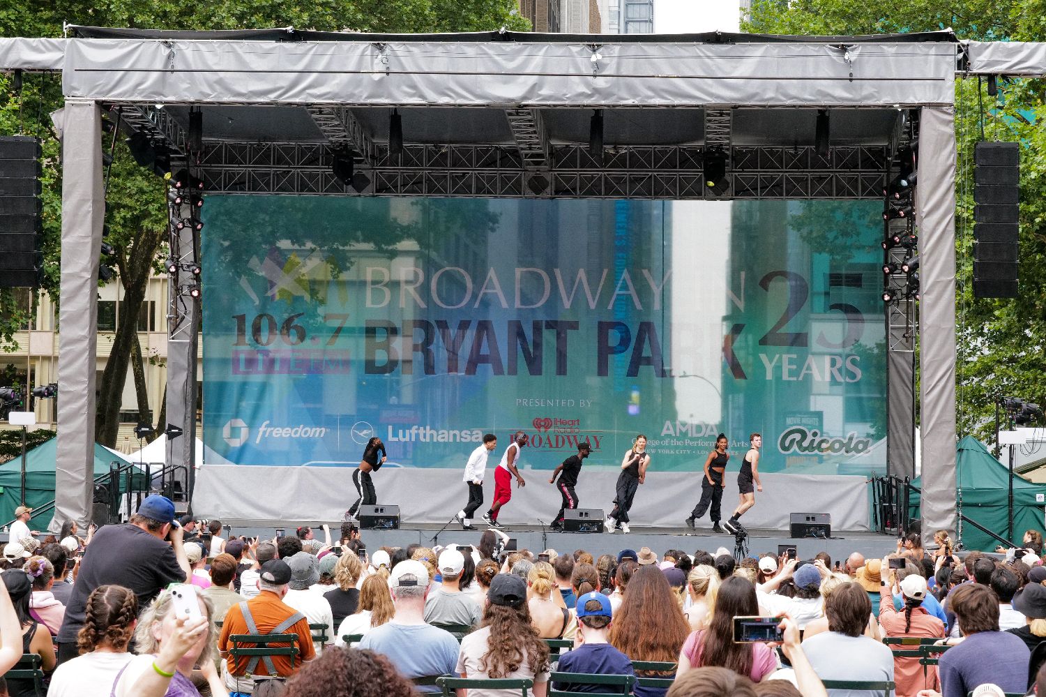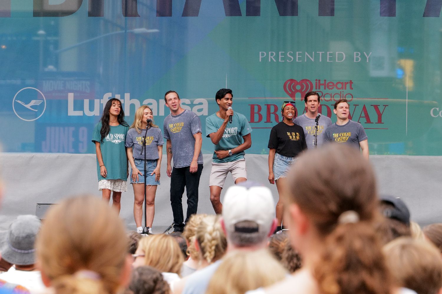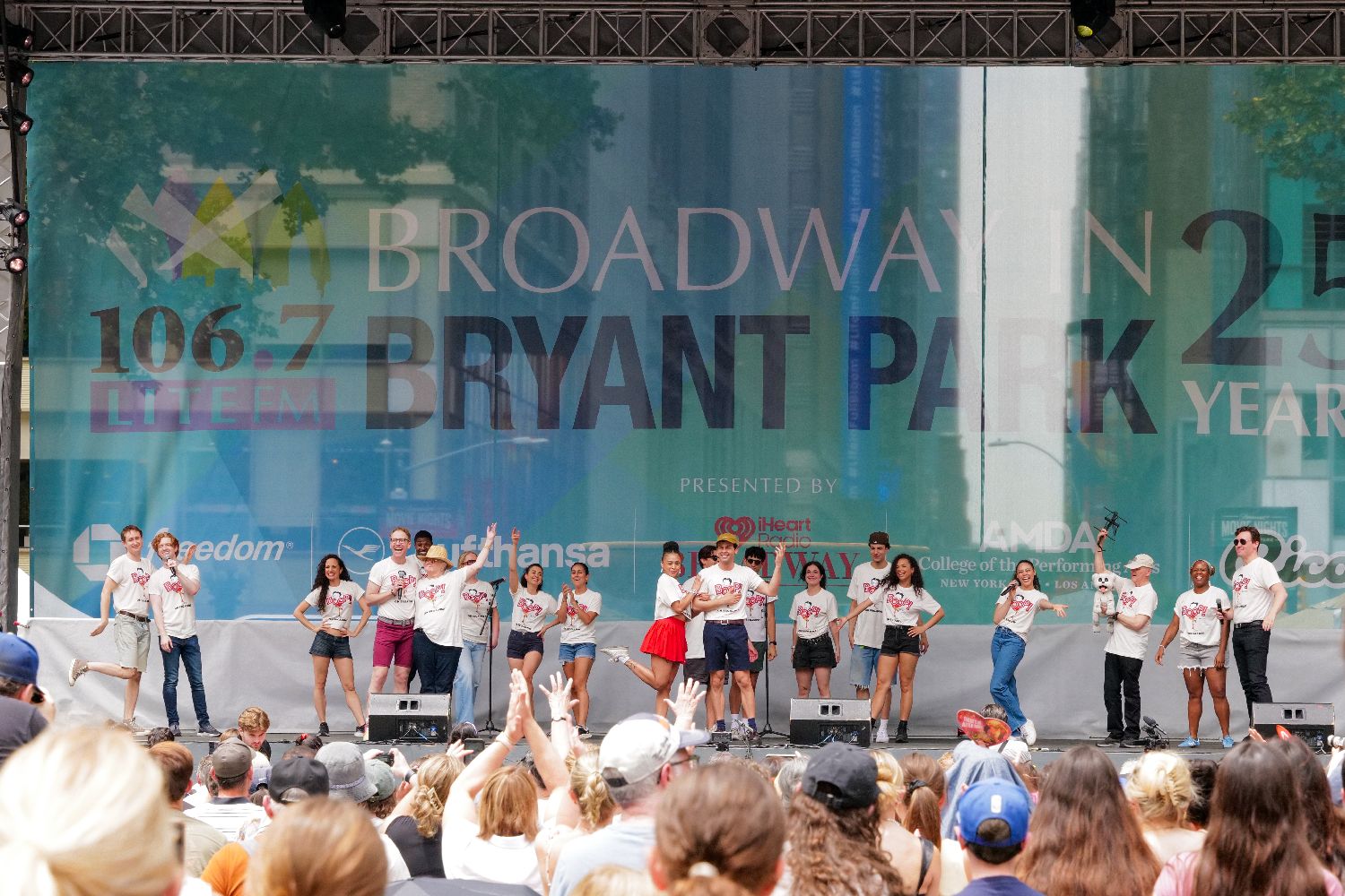 作为纽约最受欢迎的夏季公共活动之一,“百老汇在布莱恩公园”今年迎来25周年庆典。图为音乐剧《了不起的盖茨比》(TheGreatGatsby)演员表演选段。