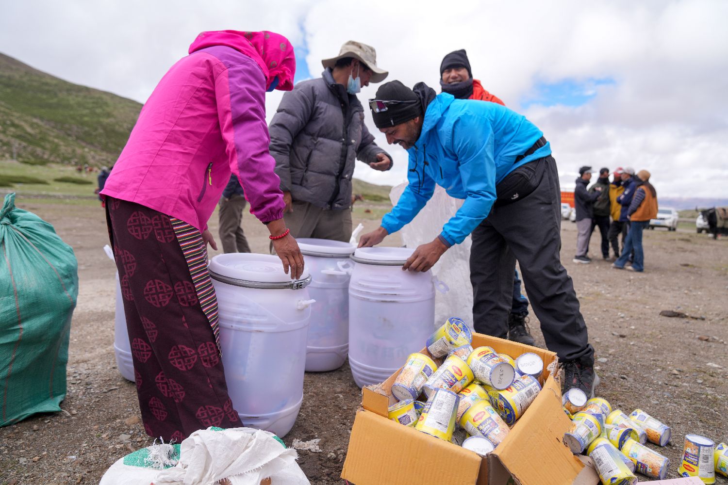 7月21日,在冈仁波齐山脚下,徒步旅行者做出发前的物资准备工作。