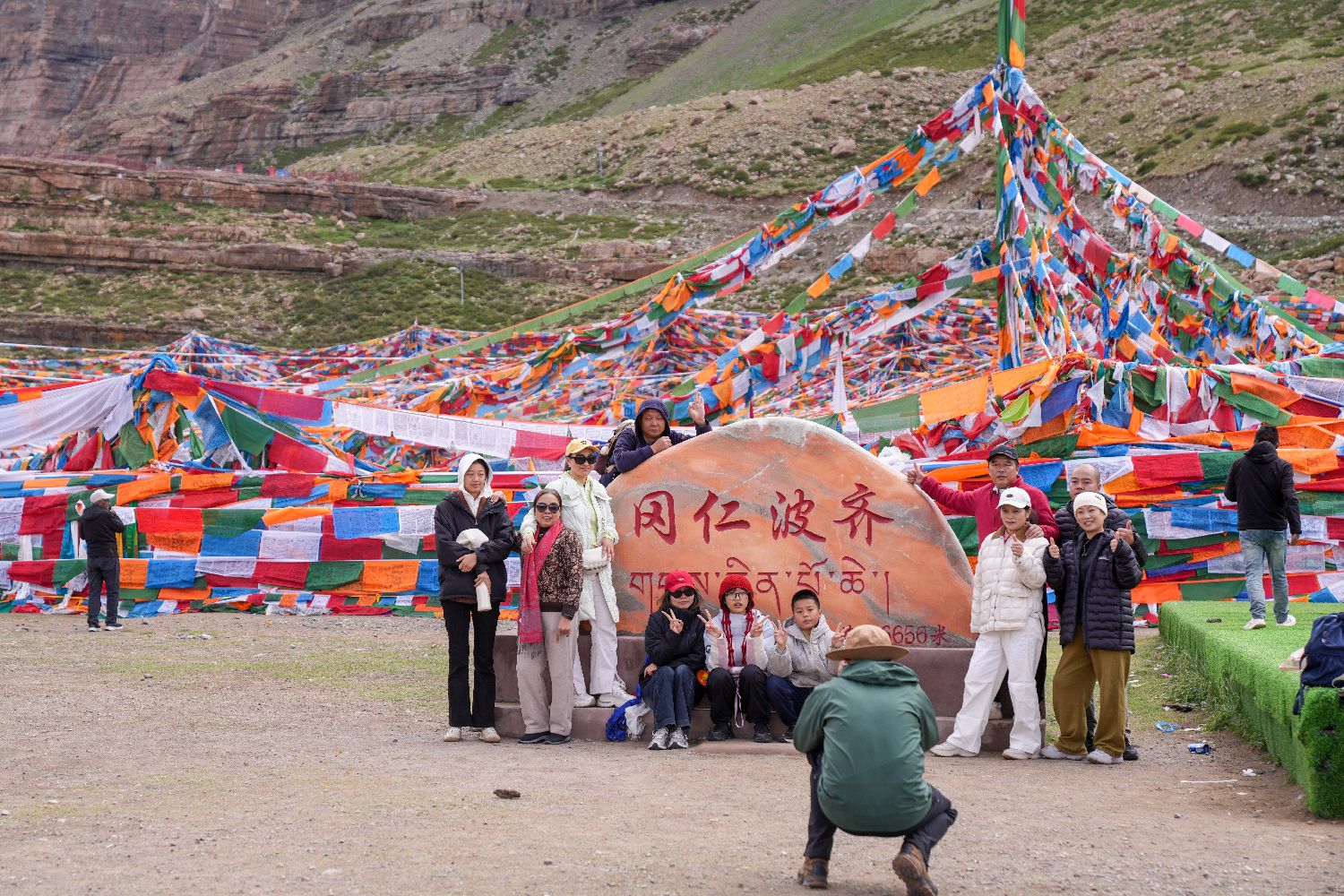 7月21日,游客在冈仁波齐山脚下的经幡广场打卡拍照。