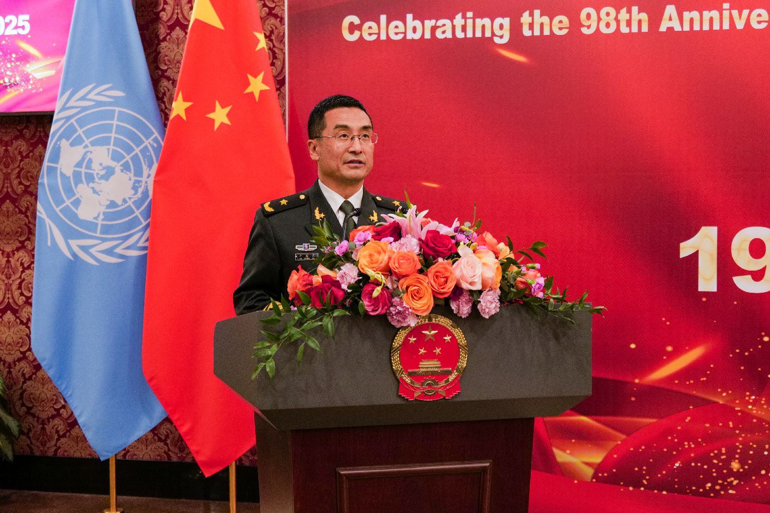 当地时间7月23日,中国常驻联合国代表团在纽约驻地举办庆祝中国人民解放军建军98周年招待会。图为中国常驻联合国代表团军事参谋团团长尹忠良少将致辞。(图片来源:本文图片均自中新社)